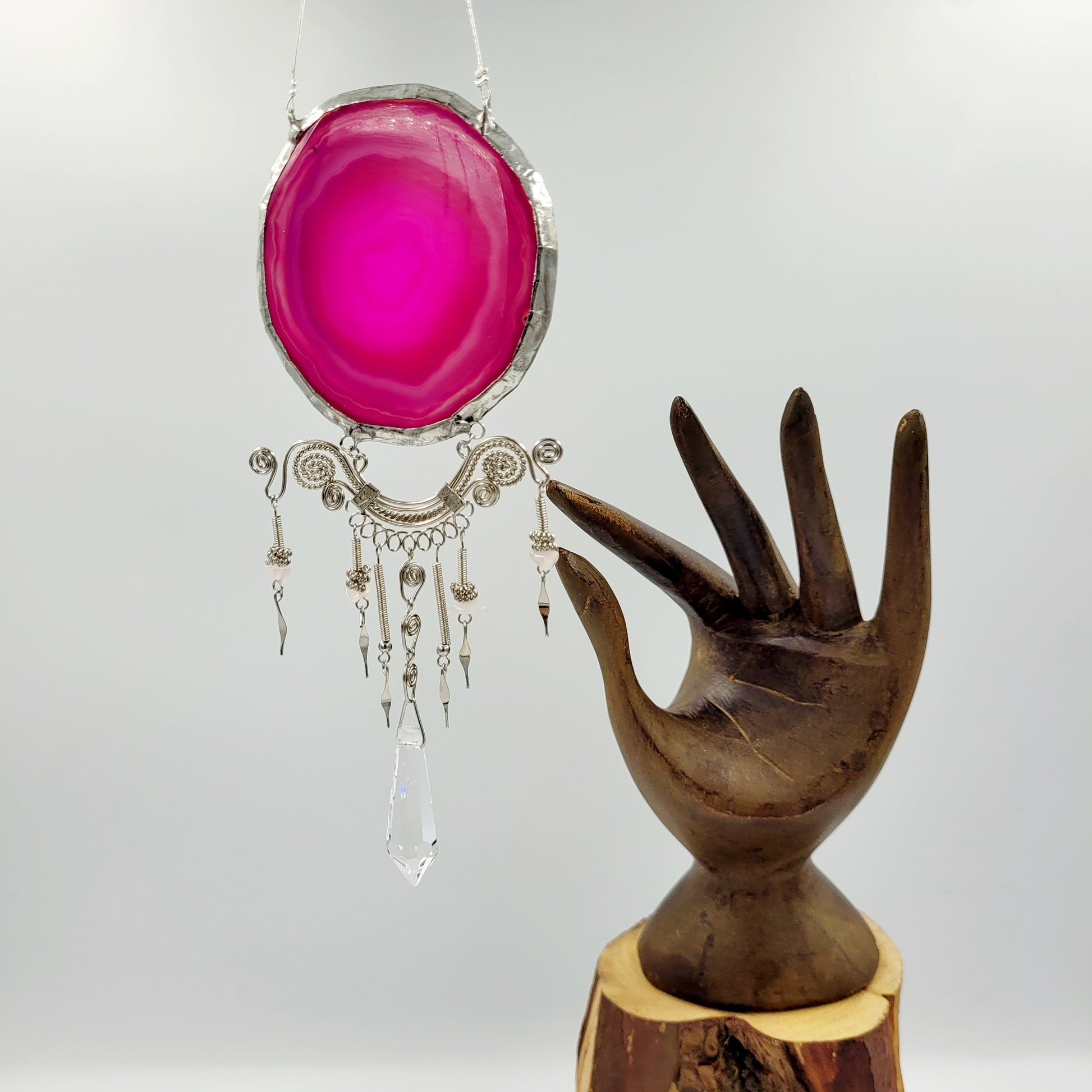 This beautiful Agate slice Hanging Crystal will brighten up any space. It contains Agate, which is known to enhance metal function, improve concentration and perception, and increase analytical abilities. Bring positive energy into your home with this stunning natural stone decoration.