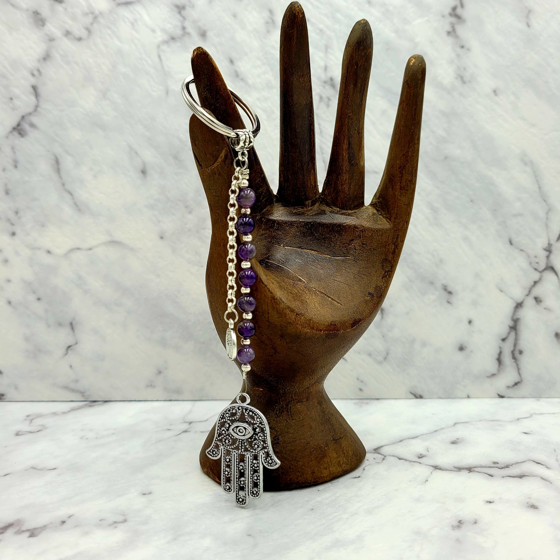 Experience serenity and safety with this Amethyst Hamsa Crystal Charm Keyring. Amethyst's protective power encourages you to find spiritual awareness and inner peace, while the hamsa symbol provides luck and protection from negative energy and evil. Find balance in your life with this beautiful keyring.