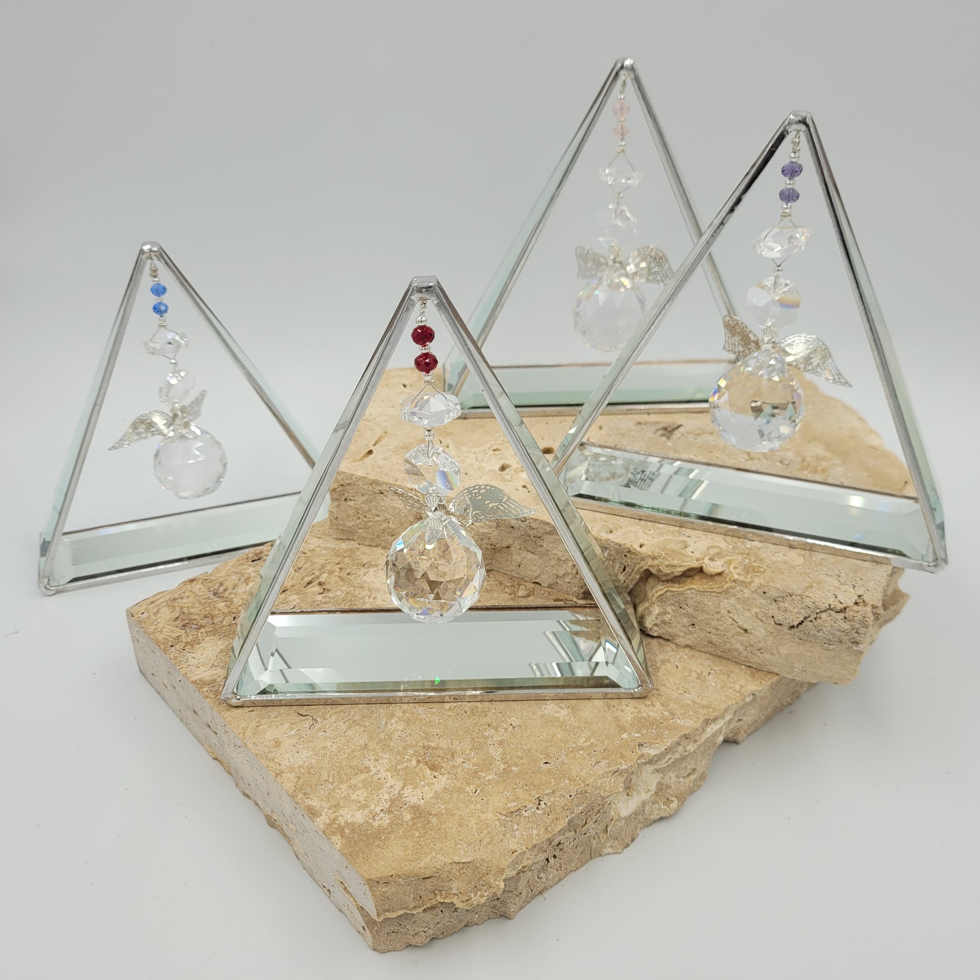 Bring peace and tranquility to your space with the Angel Triangle Bevel Glass. Featuring a beautiful angel crystal, this lovely piece emits love and harmony, creating a peaceful atmosphere in any home.