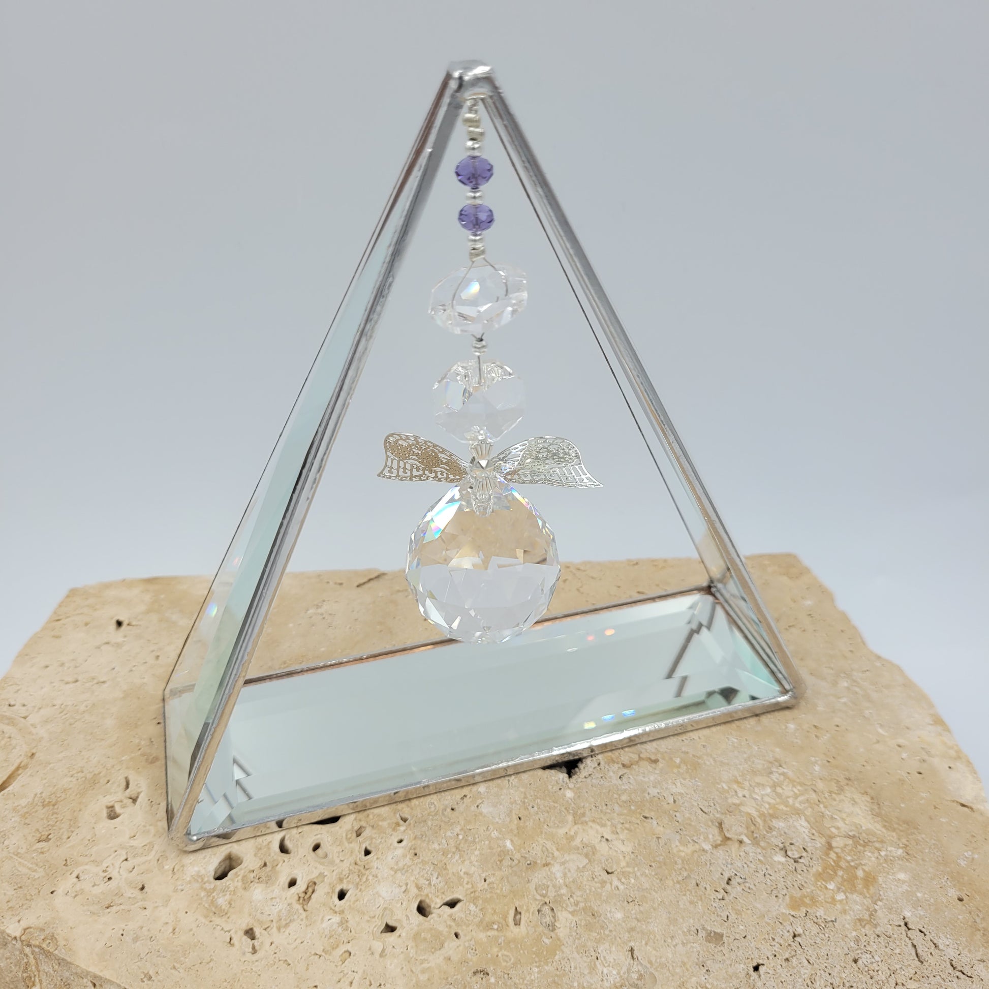 Bring peace and tranquility to your space with the Angel Triangle Bevel Glass. Featuring a beautiful angel crystal, this lovely piece emits love and harmony, creating a peaceful atmosphere in any home.