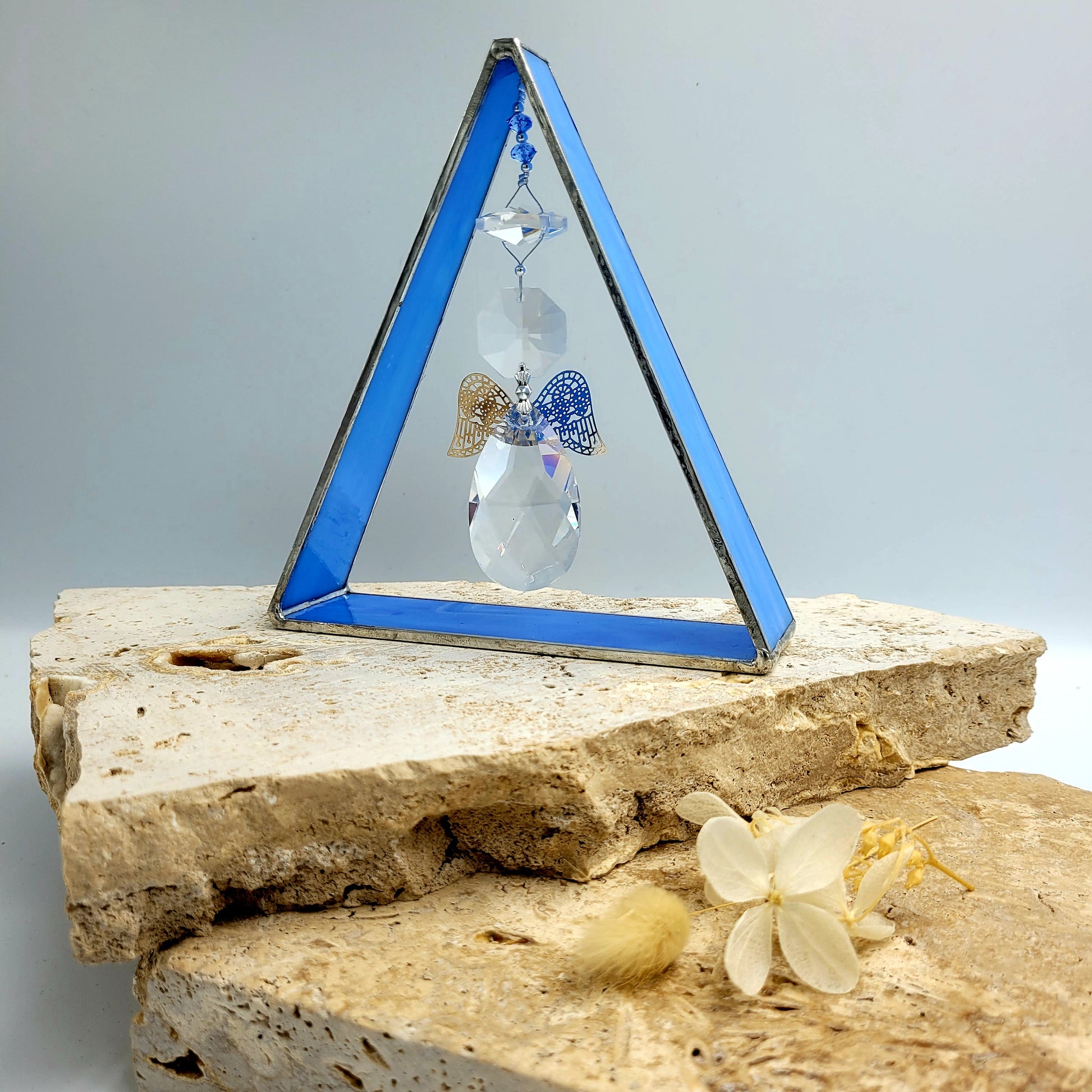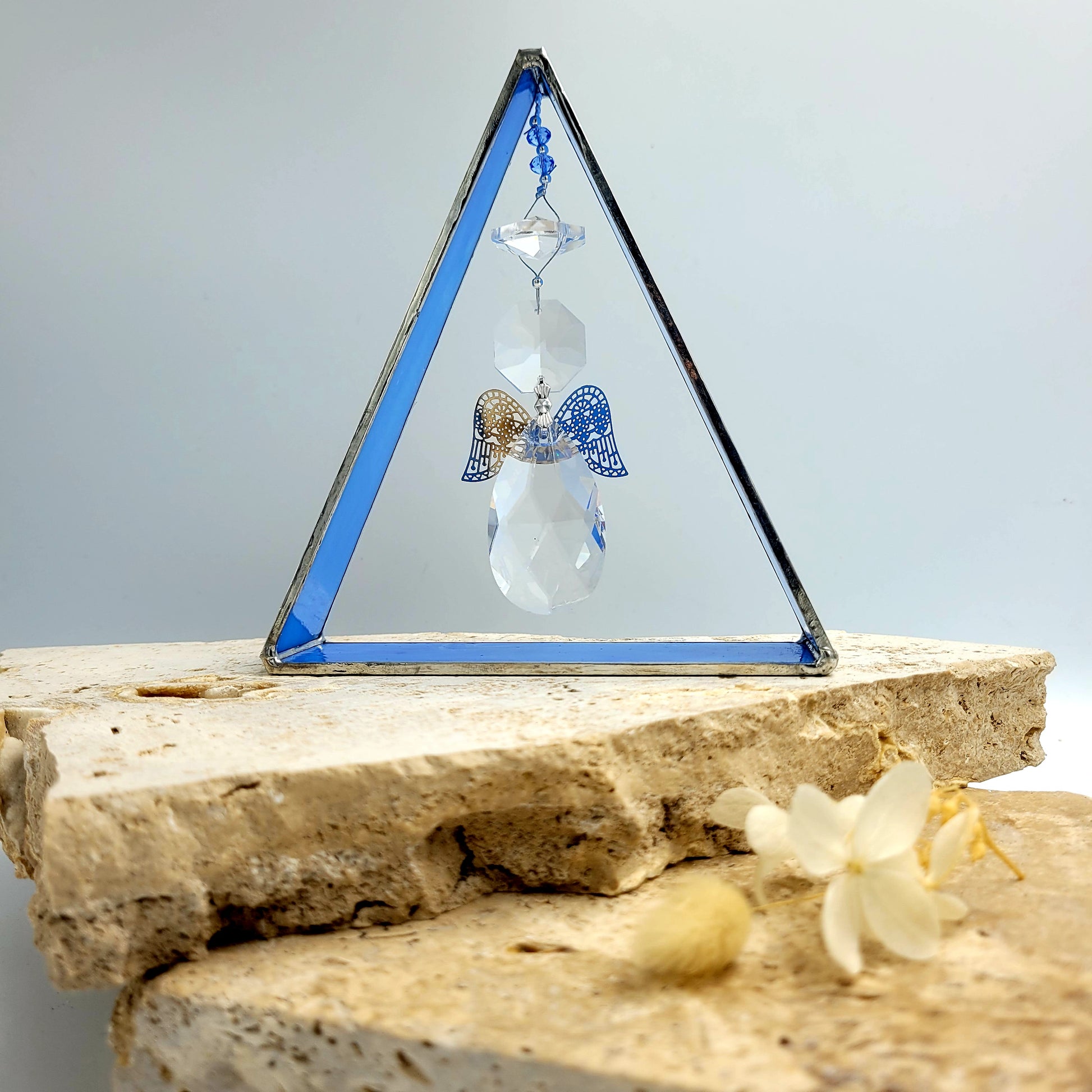 Bring peace and tranquility to your space with the Angel Triangle Stained Glass. Featuring a beautiful angel crystal, this lovely piece emits love and harmony, creating a peaceful atmosphere in any home.