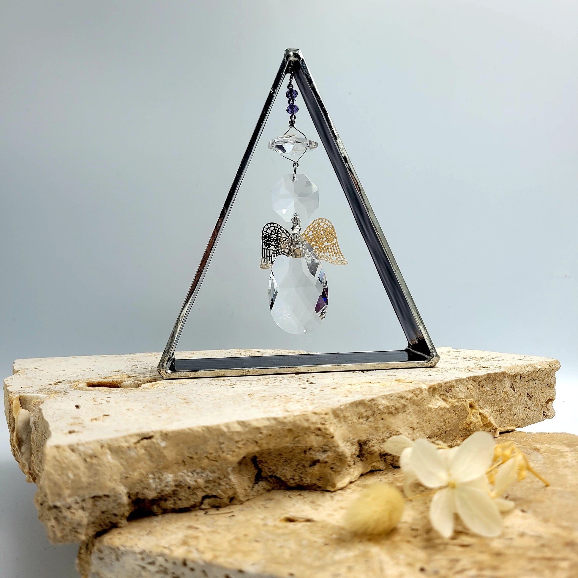 Bring peace and tranquility to your space with the Angel Triangle Stained Glass. Featuring a beautiful angel crystal, this lovely piece emits love and harmony, creating a peaceful atmosphere in any home.
