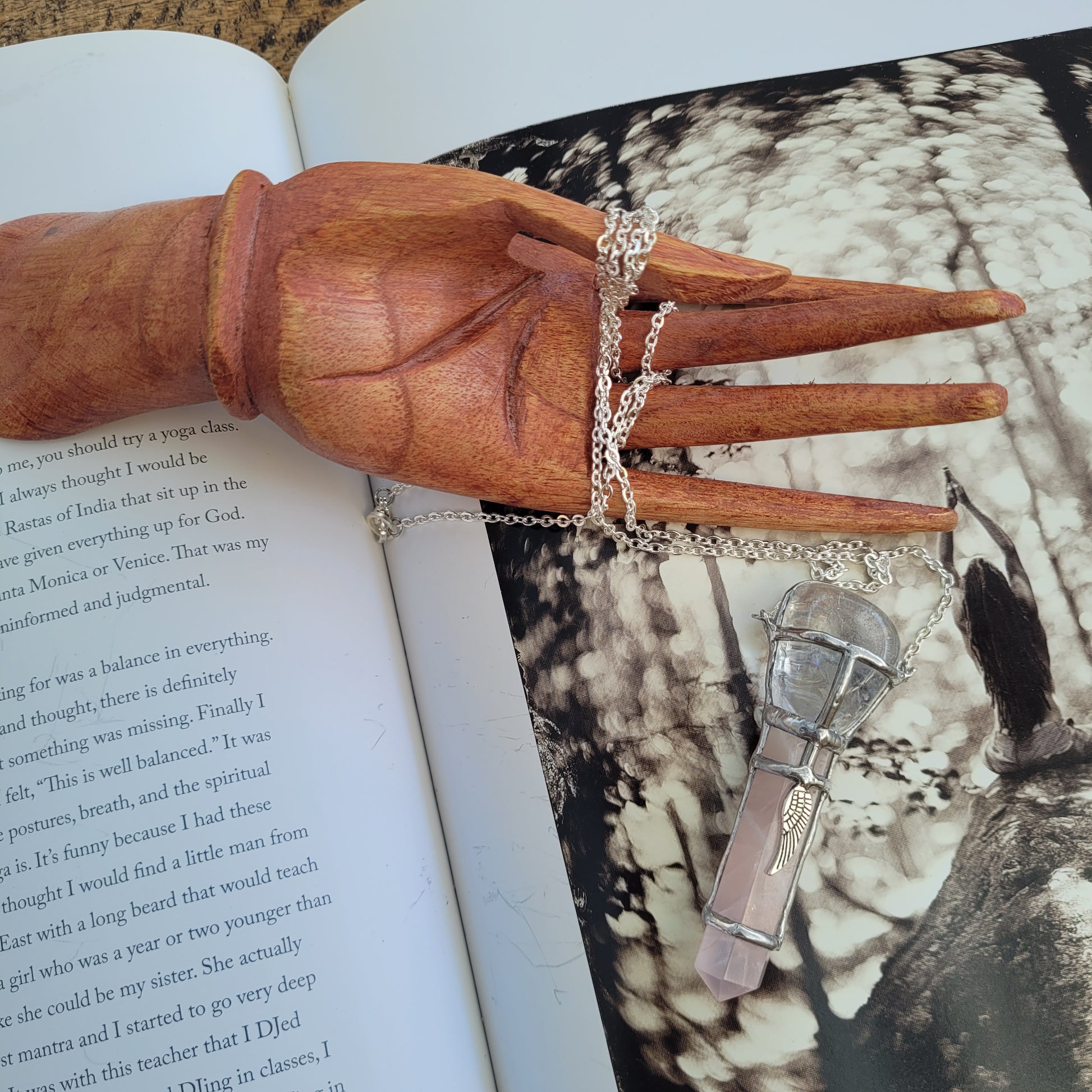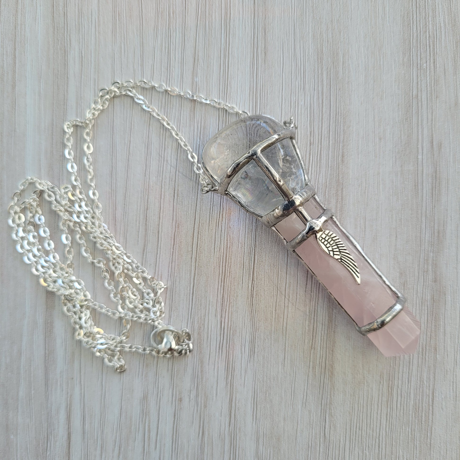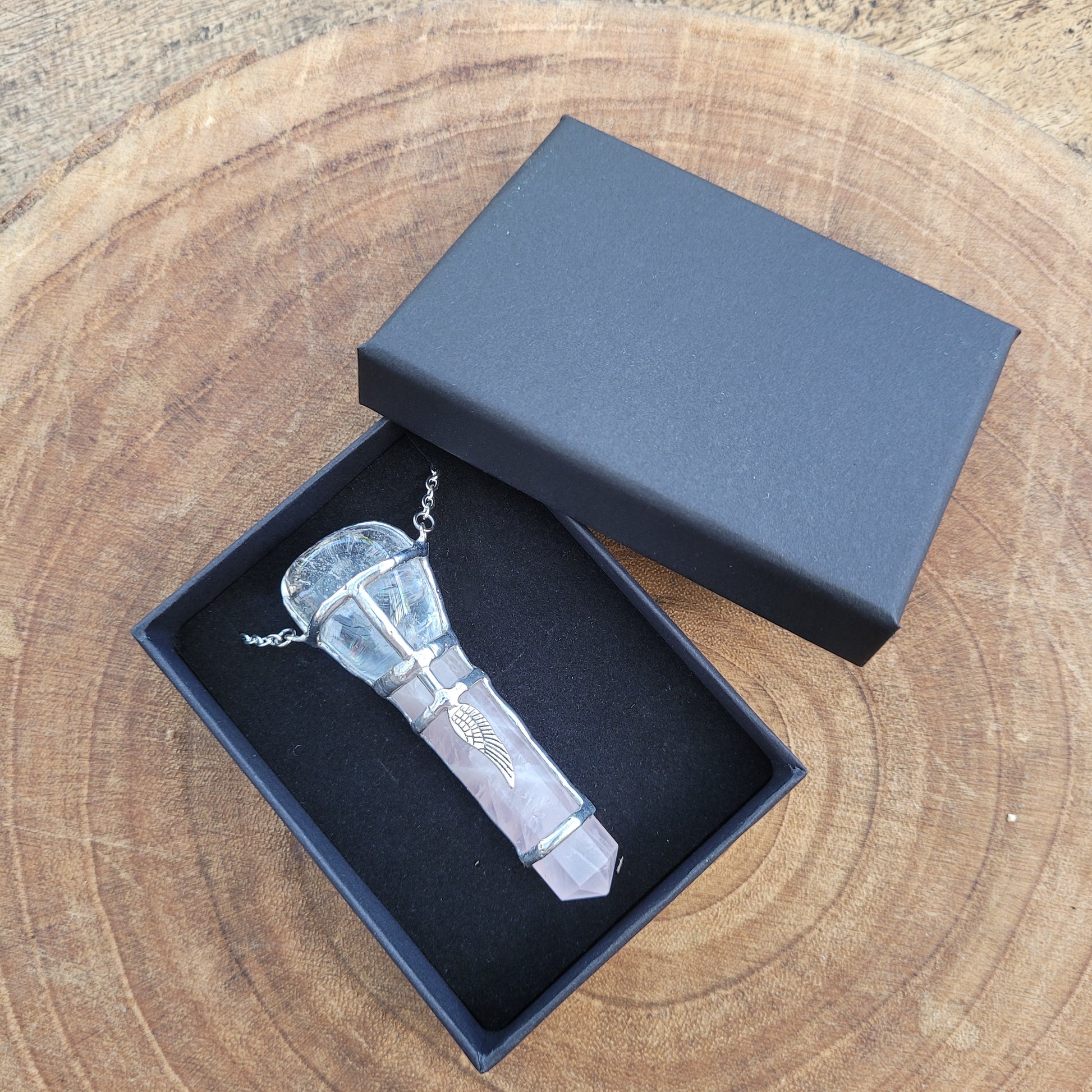 The Angelic Crystal Wand Necklace is your guardian angel. Crafted from rose quartz to remove negativity, and clear quartz to awaken consciousness, it will restore self-love and bring harmony to even the most trying times. Carry it with you and feel the loving embrace of its magical powers!