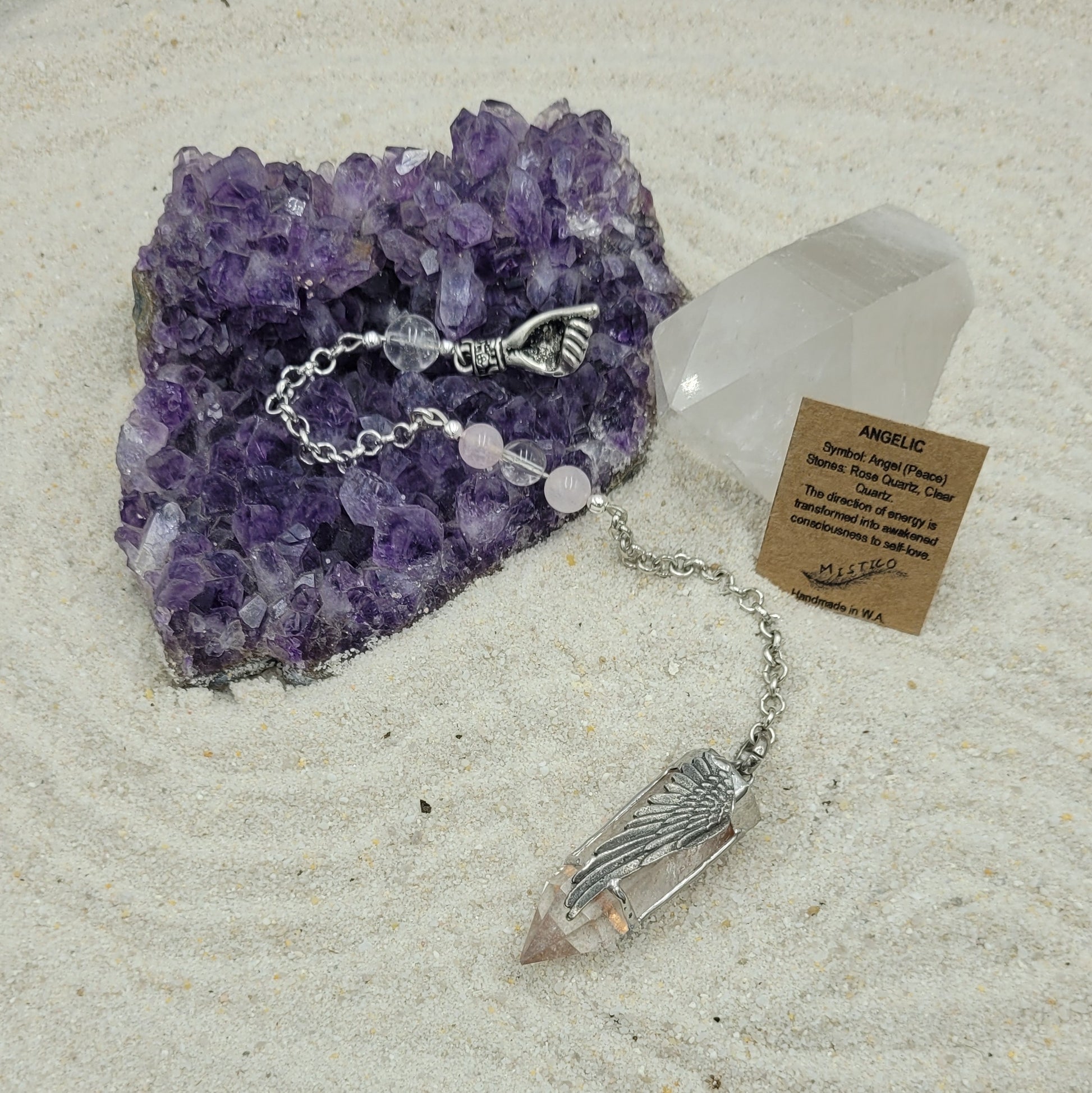 The Angelic Pendulum is your guardian angel. Crafted from rose quartz to remove negativity, and clear quartz to awaken consciousness, it will restore self-love and bring harmony to even the most trying times. Carry it with you and feel the loving embrace of its magical powers!