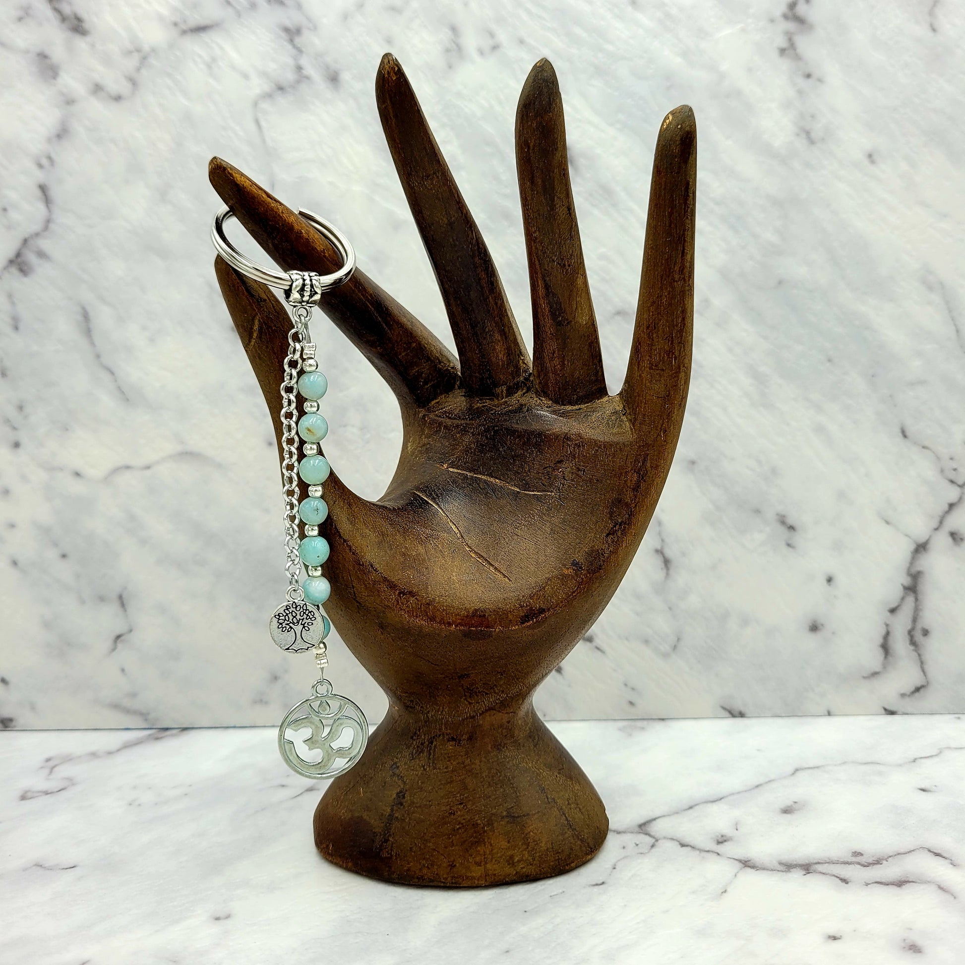 Our Aquamarine Om Crystal Charm Keyring offers you more than just a stylish accessory. It is the perfect tool to help you channel the power of aquamarine; with its calming properties, it can help you tap into your inner wisdom and gain insight, truth, and clarity. Its sacred union of mind, body, and spirit will help you unlock your deepest desires and bring positive energy into your life.