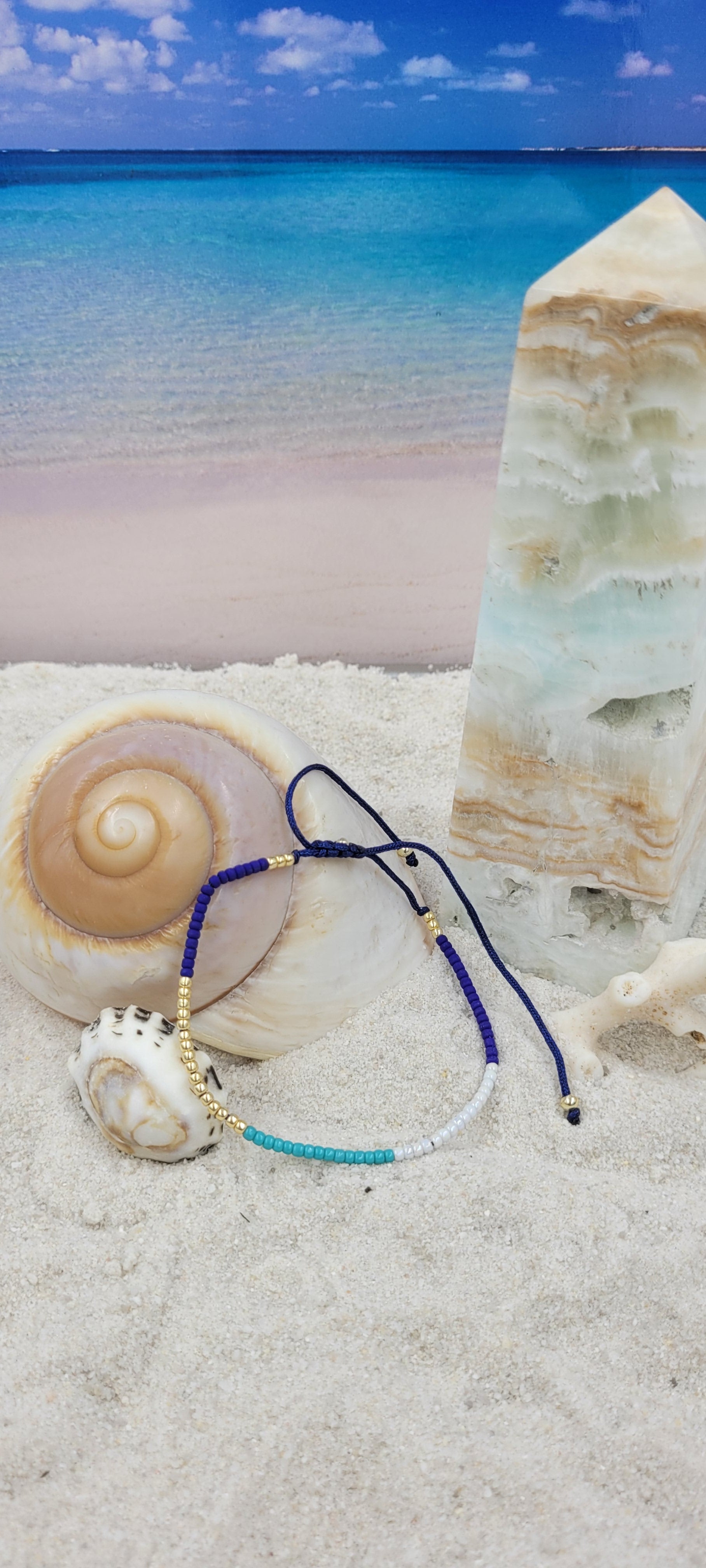 Experience the beauty of handmade jewelry with these lovely Bracelets Beads adjustable String 1" Aqua,white,Blue & Gold. Crafted with care, they feature vibrant colorful beads that bring a cheerful accent to any ensemble. Their adjustable size ensures a comfortable and secure fit.