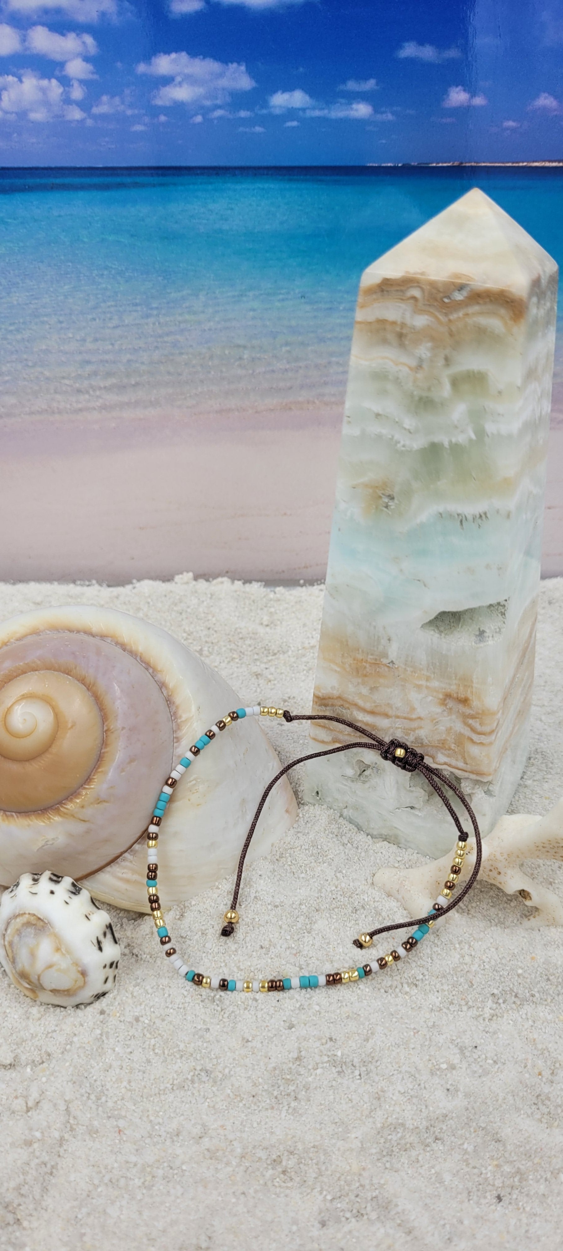 Experience the beauty of handmade jewelry with these lovely Bracelets Beads adjustable String 1" Aqua, white & gold. Crafted with care, they feature vibrant colorful beads that bring a cheerful accent to any ensemble. Their adjustable size ensures a comfortable and secure fit.