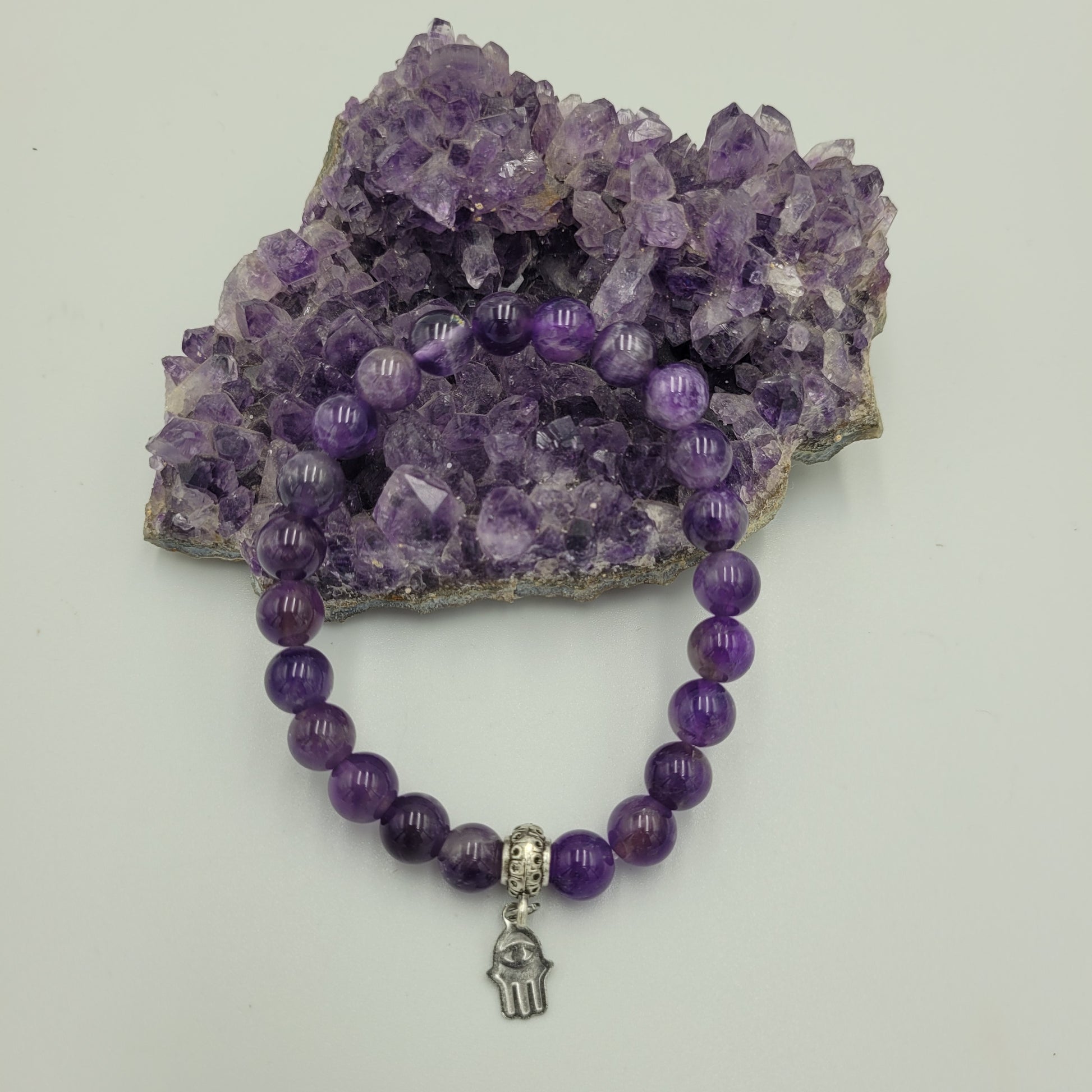 This bracelet 8mm Hamsa is crafted with natural Amethyst gemstones that offer calming and tranquilizing properties. Wear it to help promote serenity and control temperament.