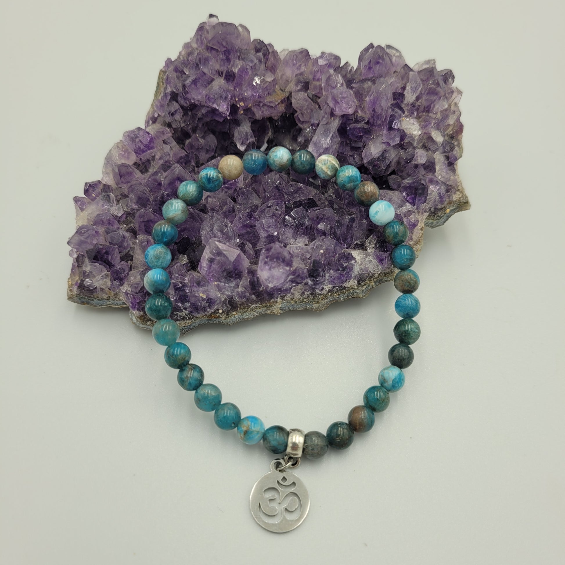 This beautiful Bracelet Apatite 6mm Om is the perfect blend of fashion and function. Crafted with natural 6mm apatite stones, it is said to bring peace and harmony, and facilitate clear intellect and concentration. By enhancing unconditional love, it also helps to focus the mind and allows learning without distraction.