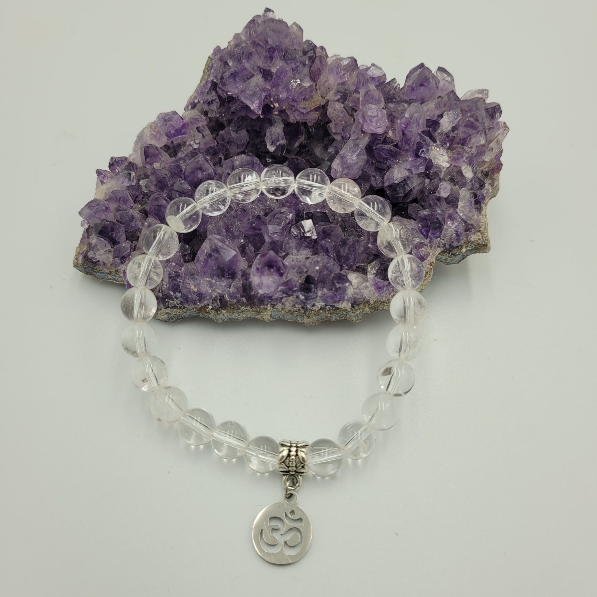 This elegant Bracelet Clear quartz 8mm Om is perfect for those who want to use the power of positive energy in their lives. It is crafted from clear quartz and helps amplify both body energy and thoughts, as well as assist in the creation of power, and stimulate positive feelings.