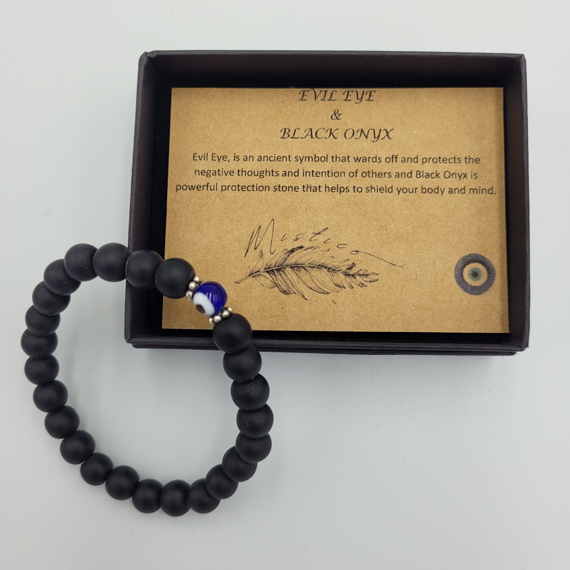 Boost your protection with these beautiful Evil Eye & Black Onyx bracelets. Featuring 8mm stones for a stylish look and enhanced protection, the Evil Eye wards off negative thoughts, while the Black Onyx helps to shield you from harm - giving you peace of mind and confidence to go about your day. Wear the power of protection!