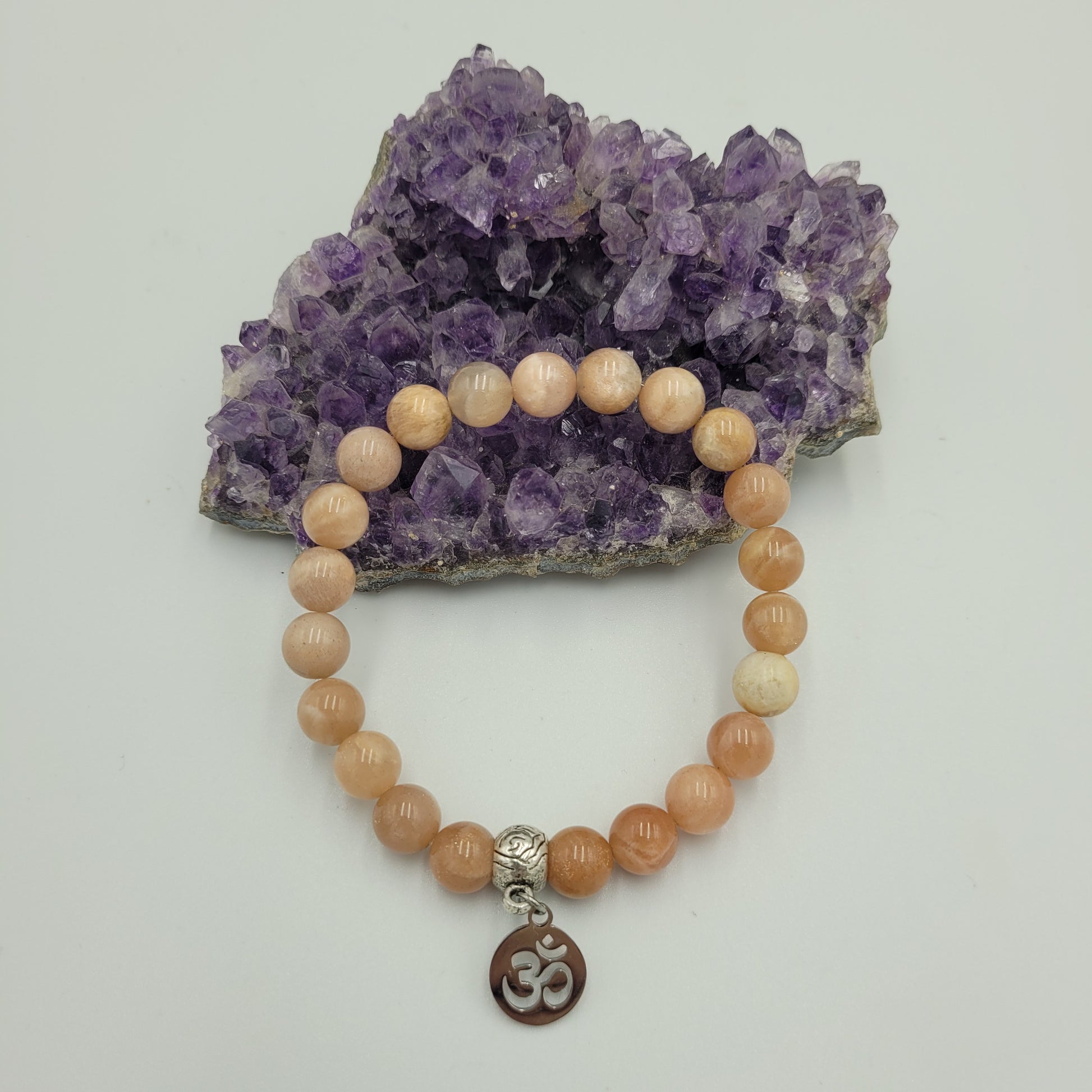 This Om Bracelet is crafted with 8mm Peach Moon Stone beads. This semi-precious stone is believed to stimulate sudden inspiration and intuitive knowing, helping you to tap into your creative energies and embrace the unexpected.
