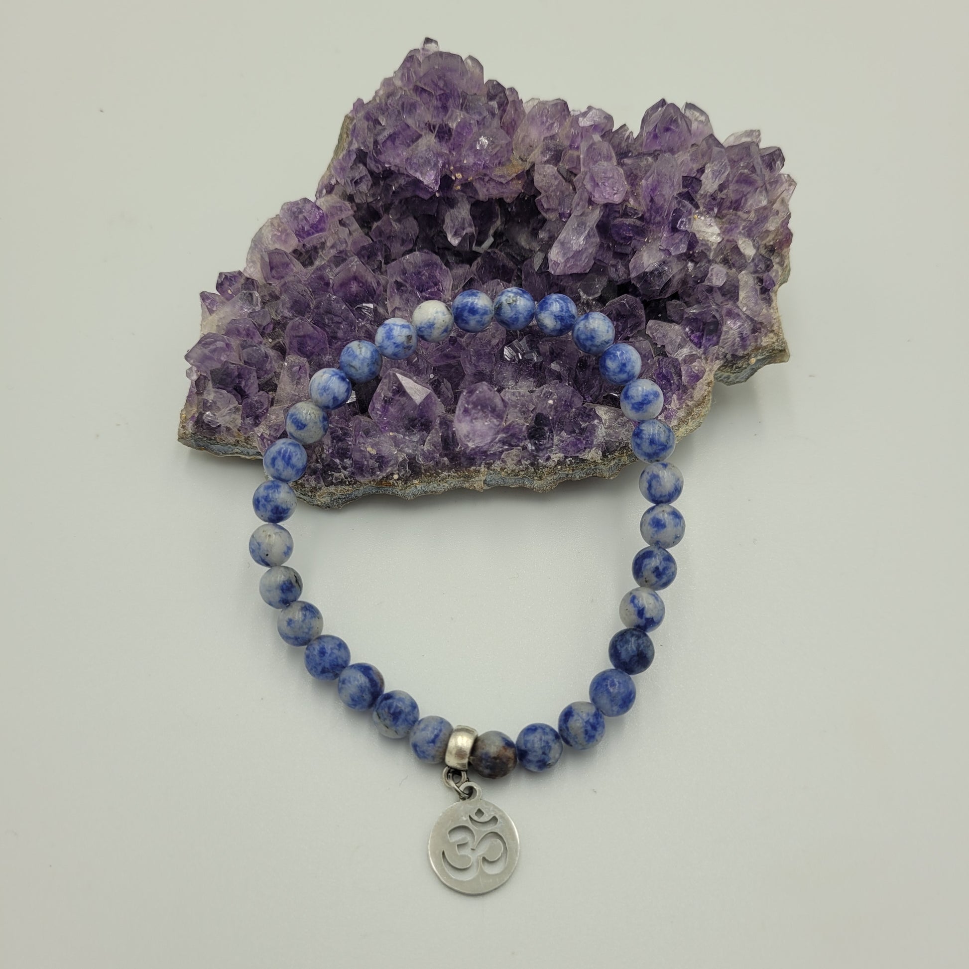 This 6mm Om bracelet is made of a beautiful Sodalite stone, known for its ability to stimulate logical thinking and help you reason through problems. Its soft, calming energy can help sharpen the intellect and provide clarity when presented with difficult decisions.