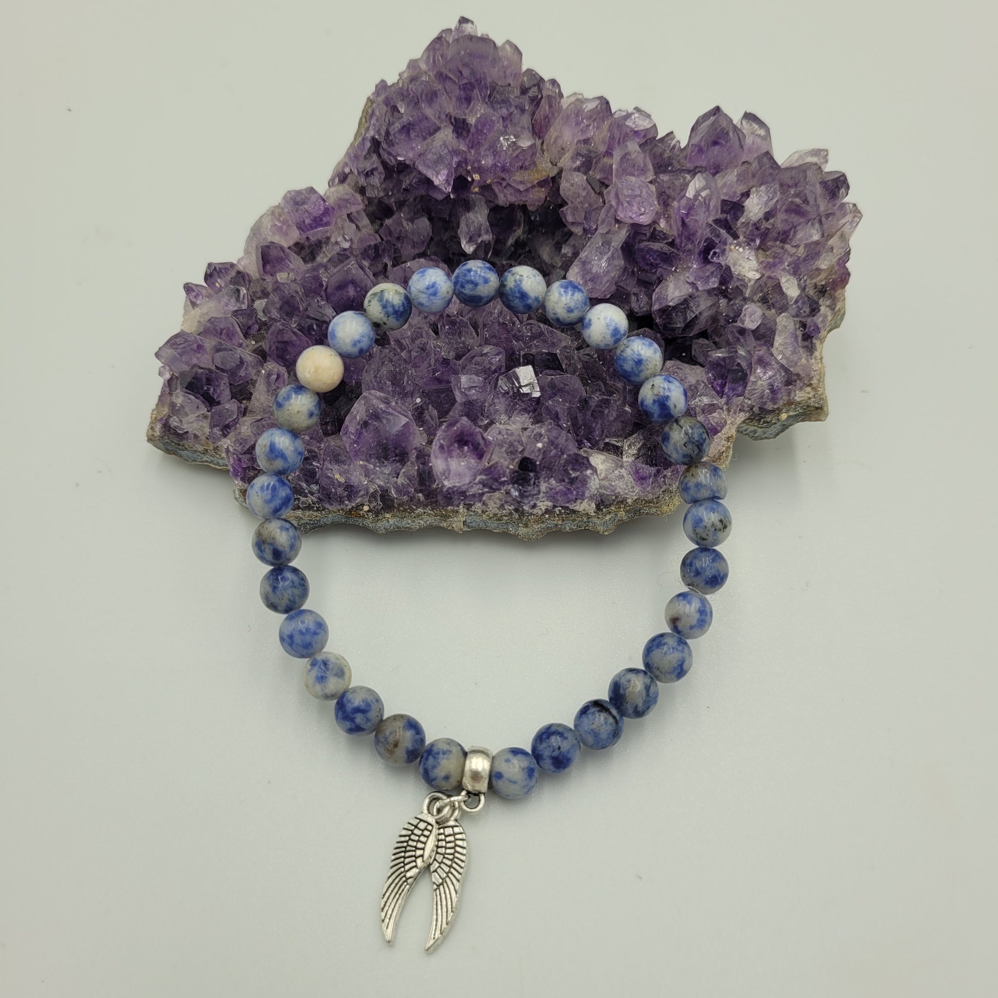 This 6mm Wings bracelet is made of a beautiful Sodalite stone, known for its ability to stimulate logical thinking and help you reason through problems. Its soft, calming energy can help sharpen the intellect and provide clarity when presented with difficult decisions.