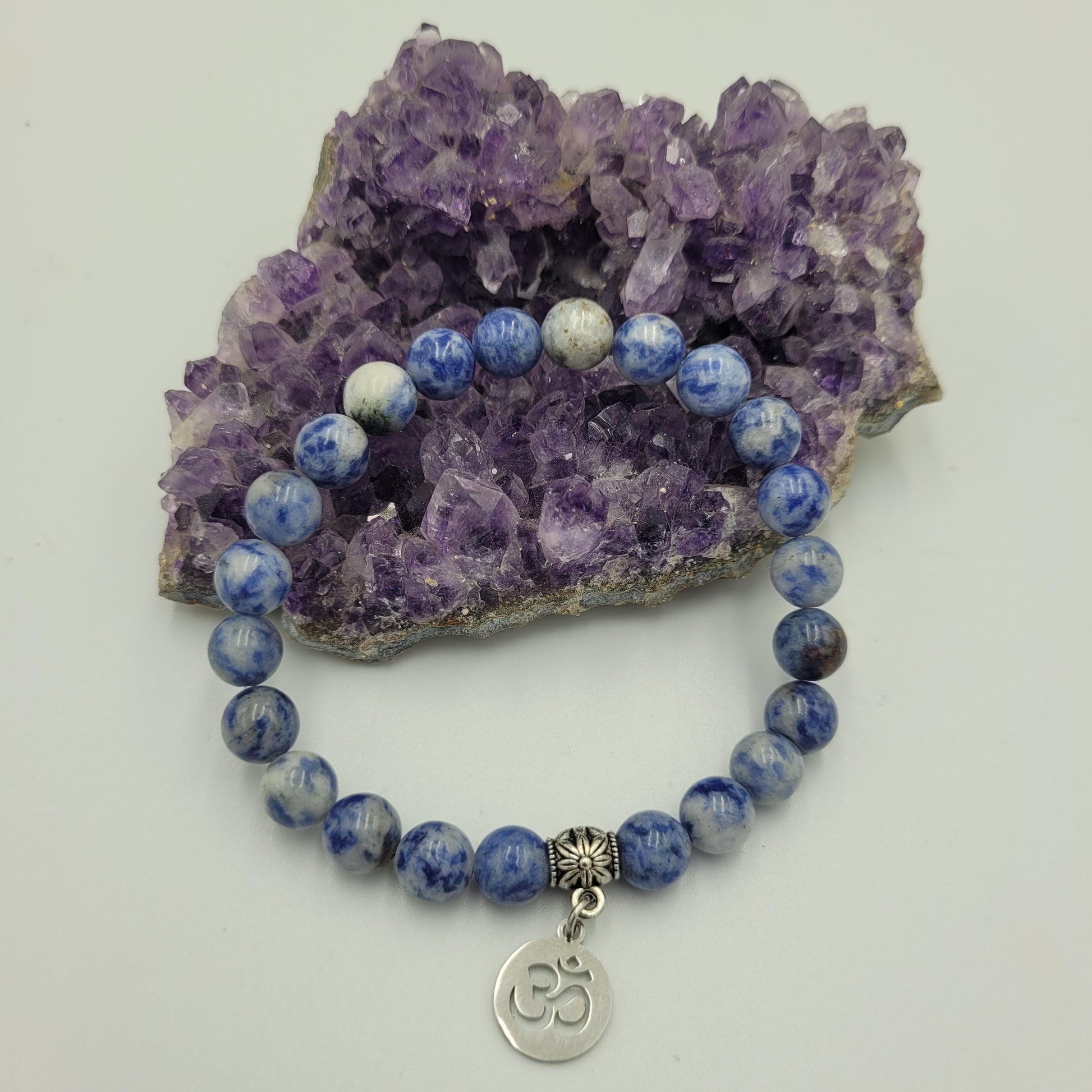 This 8mm Om bracelet is made of a beautiful Sodalite stone, known for its ability to stimulate logical thinking and help you reason through problems. Its soft, calming energy can help sharpen the intellect and provide clarity when presented with difficult decisions.