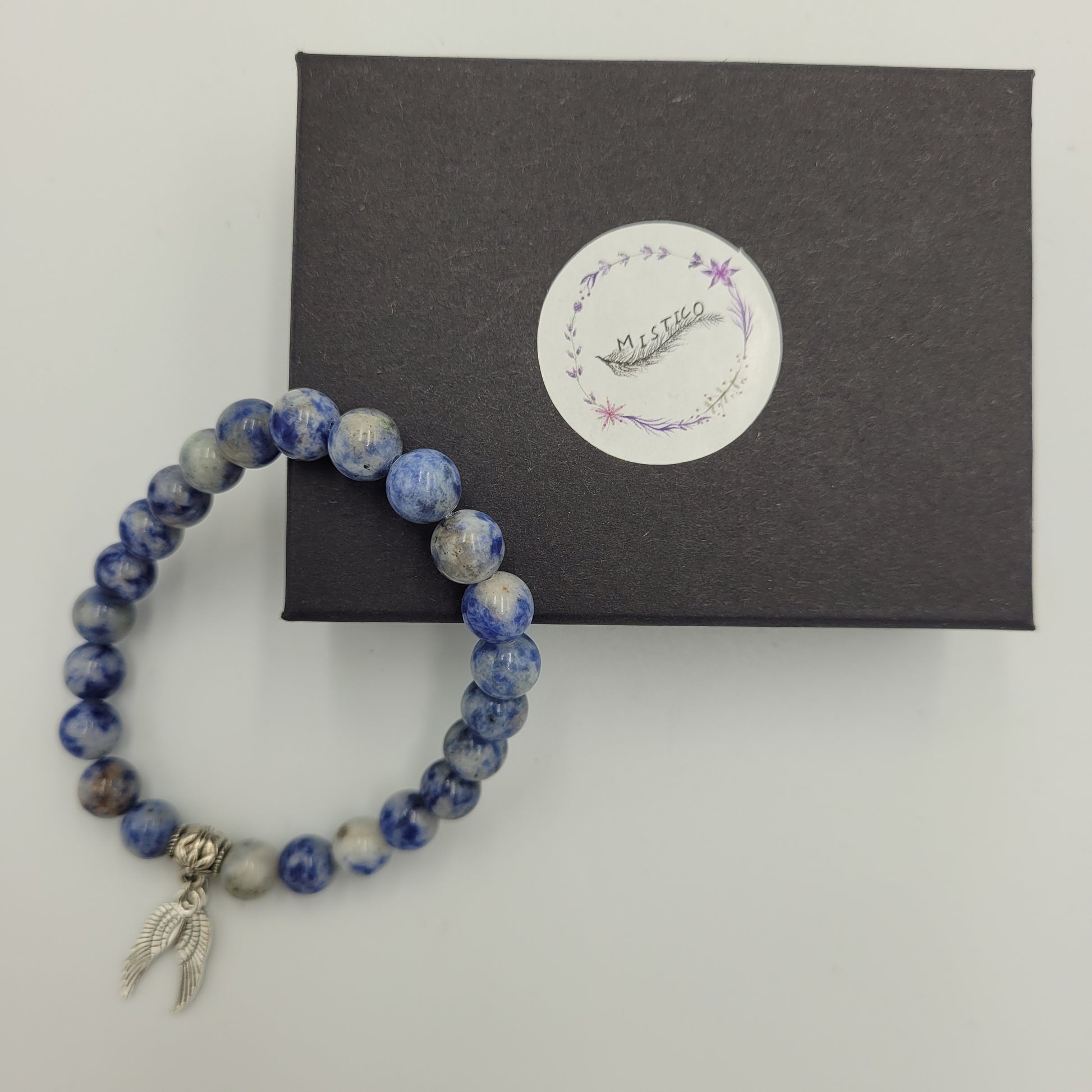 This 8mm Wings bracelet is made of a beautiful Sodalite stone, known for its ability to stimulate logical thinking and help you reason through problems. Its soft, calming energy can help sharpen the intellect and provide clarity when presented with difficult decisions.