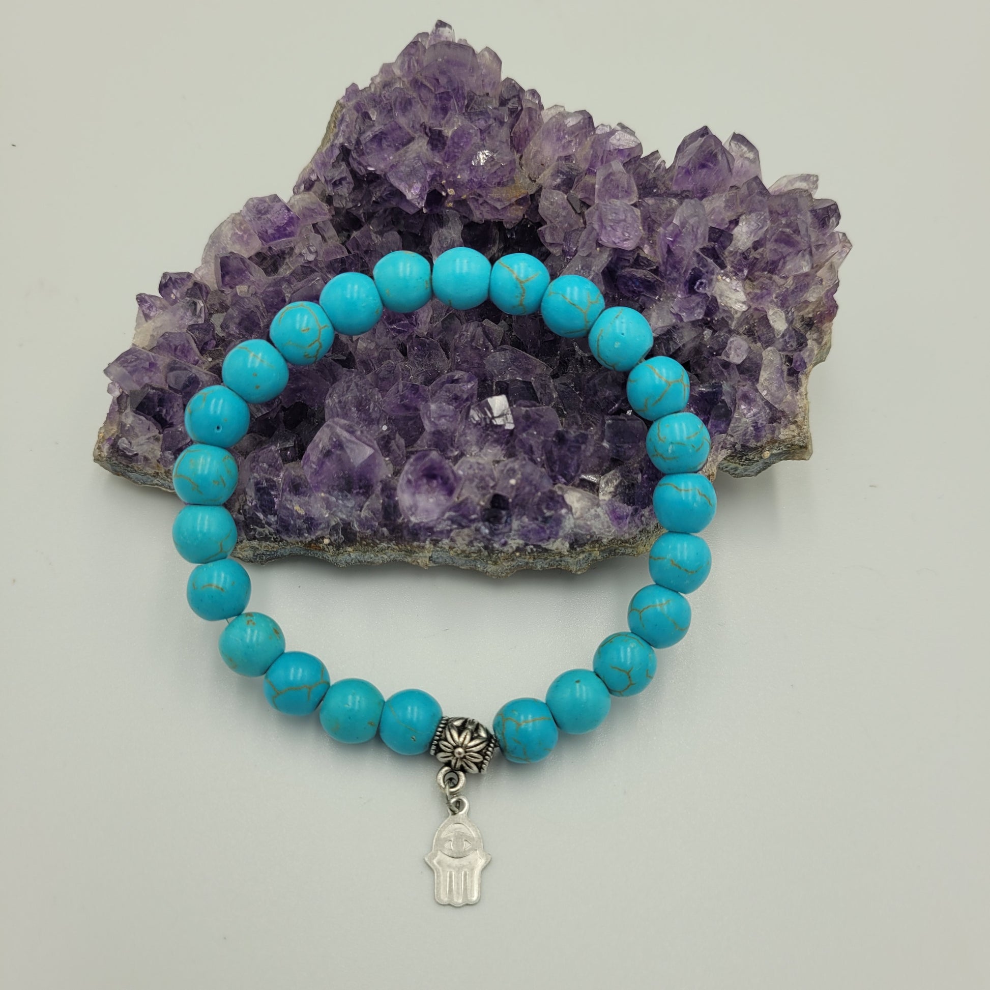 This 8mm Hamsa bracelet features a high-quality turquoise stone, known for its emotional healing qualities. Combining the protective power of the Hamsa with the calming effect of turquoise, this bracelet is perfect for those looking to find inner peace and restore emotional wellbeing.