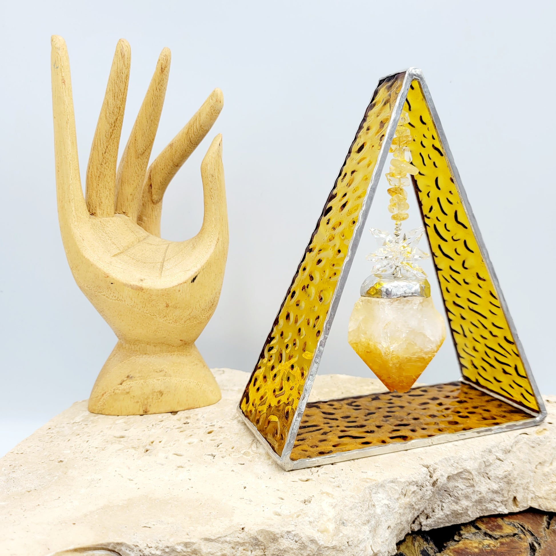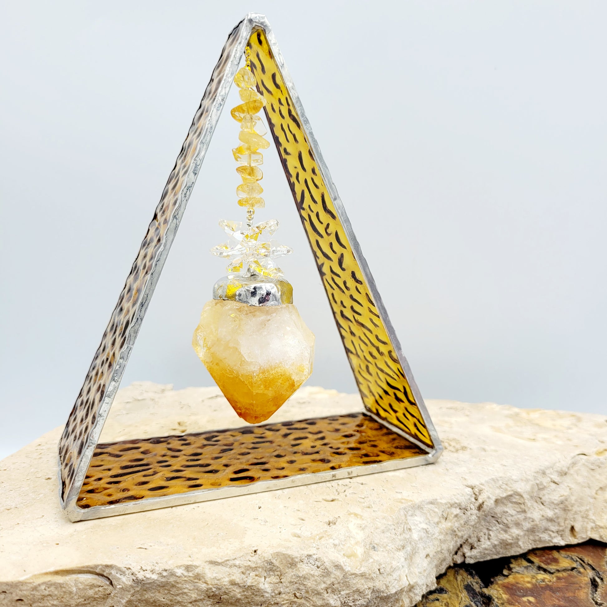 This Citrine Stained Glass Triangle is a powerful lucky stone that is said to bring prosperity and positive energy to dispel anger. The bright yellow hues of the citrine draw in the energy of the sun, making this triangle the perfect addition to your home or office.