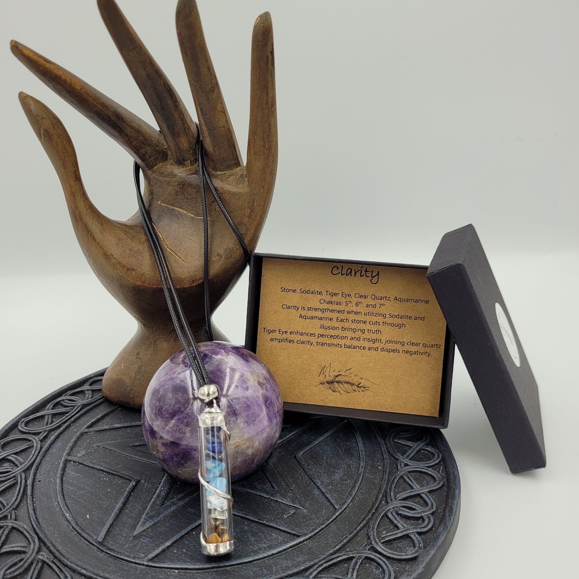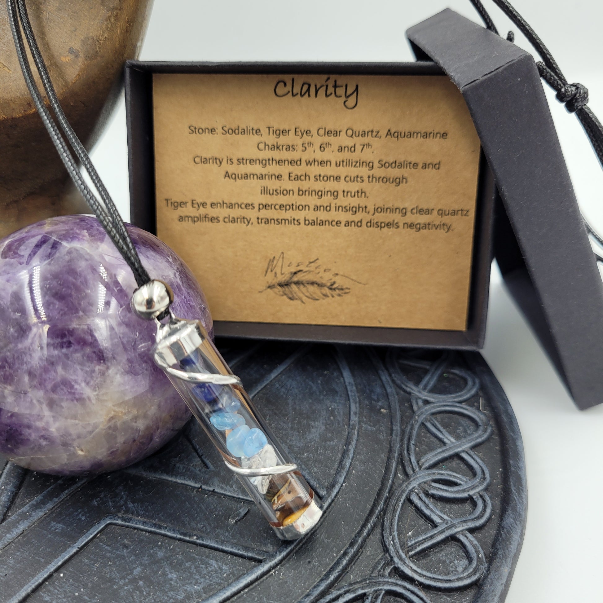 The Clarity Crystal Filled Tube Necklace is the perfect tool to achieve deeper insight. Crafted with pristine stones including Sodalite, Tiger Eye, Clear Quartz and Aquamarine, these crystals tap into the power of the 5th, 6th and 7th Chakras to strengthen clarity and truth, while enhancing perception and insight. With the addition of Clear Quartz, this wand amplifies balance and dispels any negativity. Experience a heightened state of understanding with this luxurious tool.