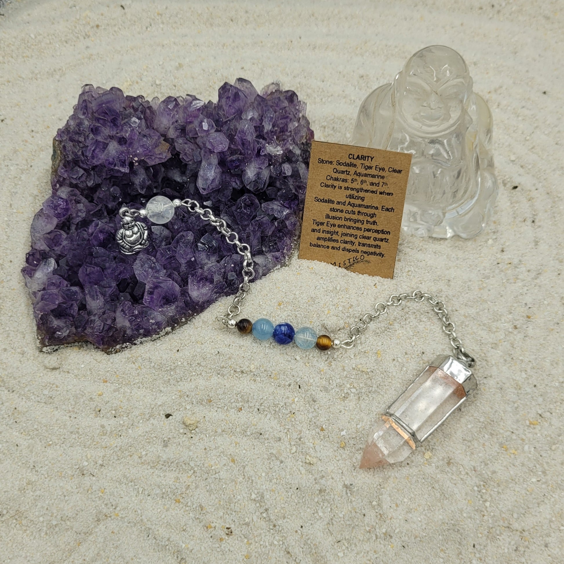 The Clarity Pendulum is the perfect tool to achieve deeper insight. Crafted with pristine stones including Sodalite, Tiger Eye, Clear Quartz and Aquamarine, these crystals tap into the power of the 5th, 6th and 7th Chakras to strengthen clarity and truth, while enhancing perception and insight. With the addition of Clear Quartz, this pendulum amplifies balance and dispels any negativity. Experience a heightened state of understanding with this luxurious tool.