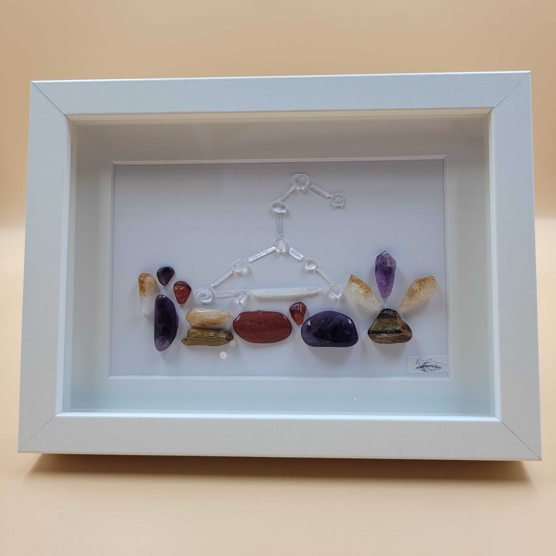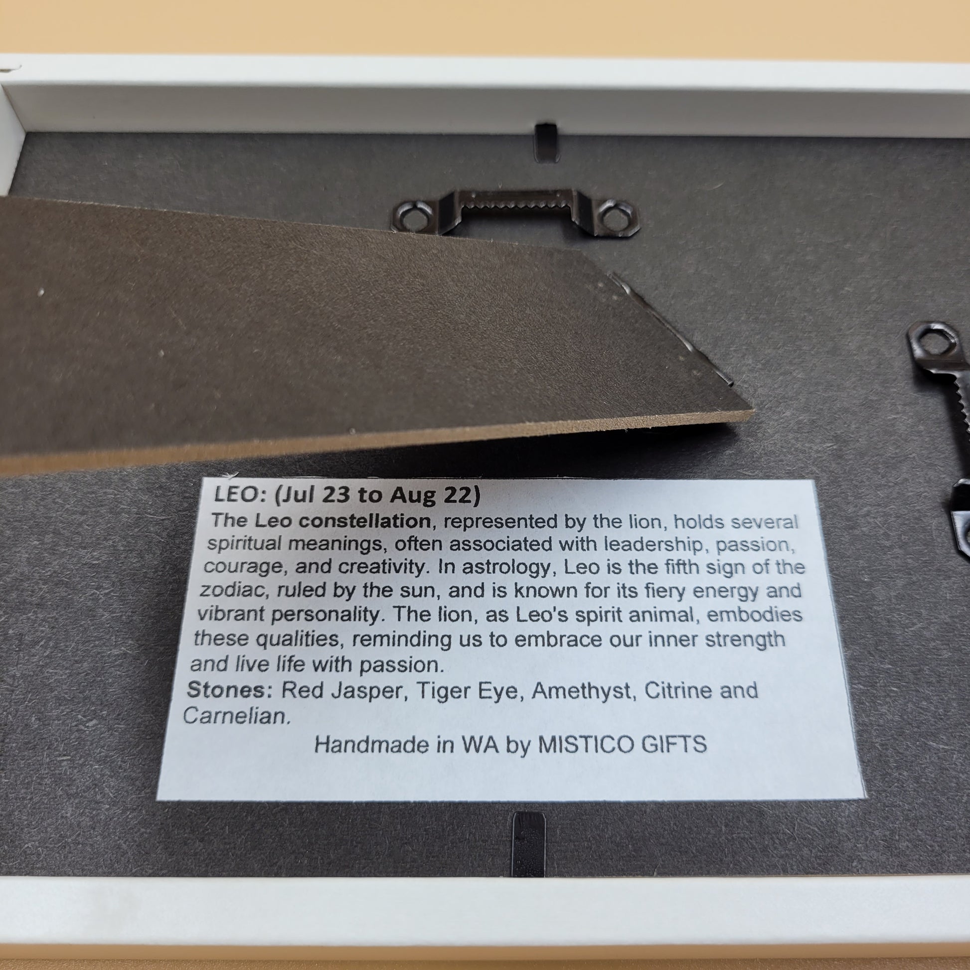 This Leo Constellation Picture captures the celestial arrangement of the fifth zodiac sign, symbolizing the lion's powerful attributes of leadership and courage. Meticulously crafted to represent Leo's fiery, sun-ruled energy, this piece incorporates the metaphysical properties of Red Jasper, Tiger Eye, Amethyst, Citrine, and Carnelian. The artwork serves as both an astrological reference and a spiritual tool, channeling Leo's passionate essence and creative force for those seeking to harness these qualities in their environment.