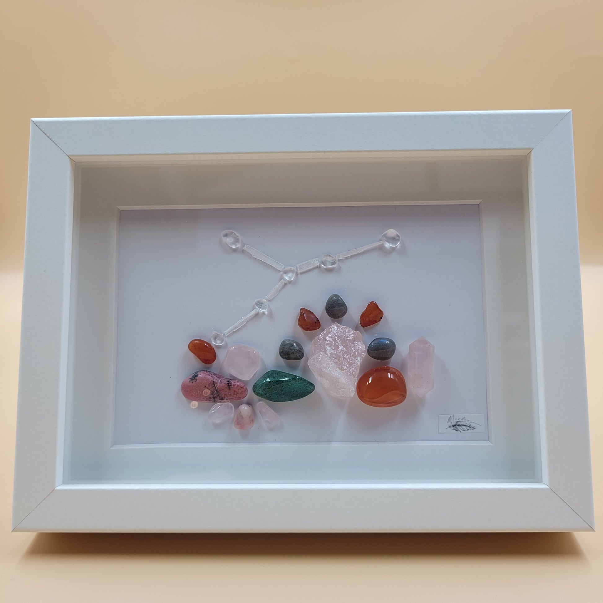Embrace the nurturing energy of the Cancer constellation with this beautiful picture. Representing emotional sensitivity and protection, Cancer connects you to intuition and psychic awareness. Like the crab moving between land and water, this artwork helps balance your emotional and material worlds. Perfect for creating a safe, comforting space in your home, this constellation picture resonates with the healing properties of Aventurine, Labradorite, Carnelian, Rose Quartz, and Rhodonite.