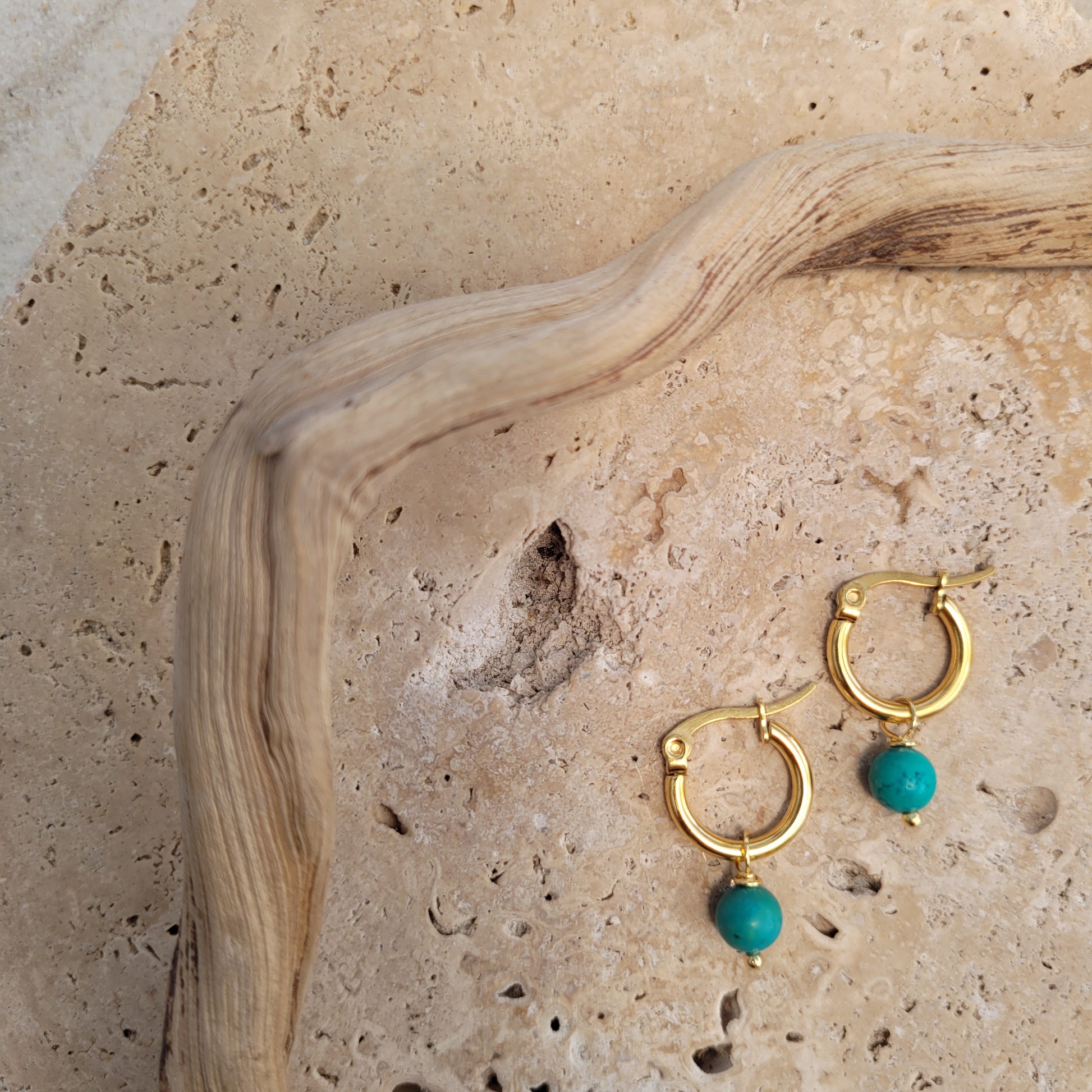 304 Stainless Steel Hoop Earrings, Hypoallergenic, Real 18K Gold Plated, with Turquoise Stone . Show off your unique style with these beautiful earrings. They're built to last with hypoallergenic stainless steel and real, 18K Gold Plating.