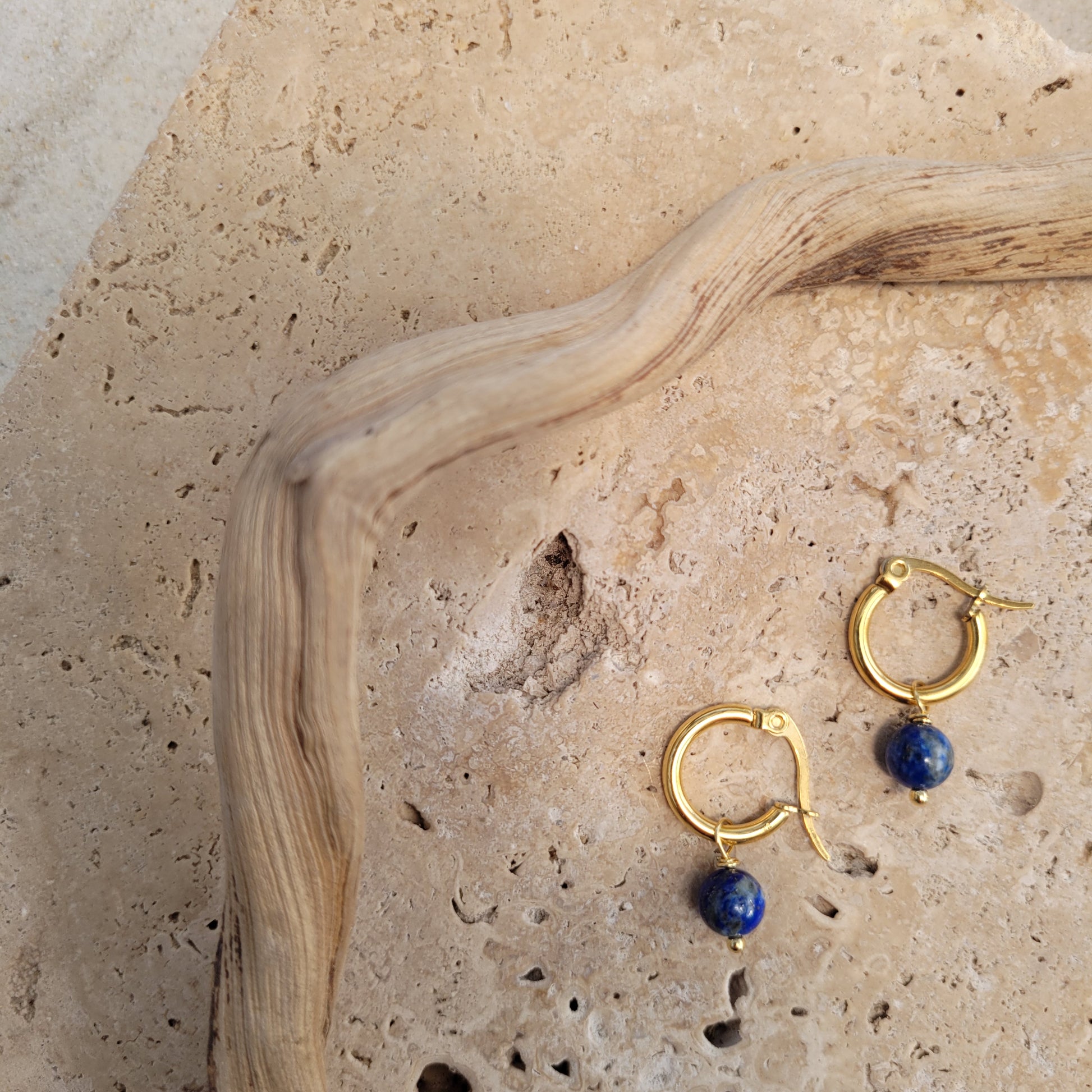 304 Stainless Steel Hoop Earrings, Hypoallergenic, Real 18K Gold Plated, with Lapiz Lazuli Stone . Show off your unique style with these beautiful earrings. They're built to last with hypoallergenic stainless steel and real, 18K Gold Plating.