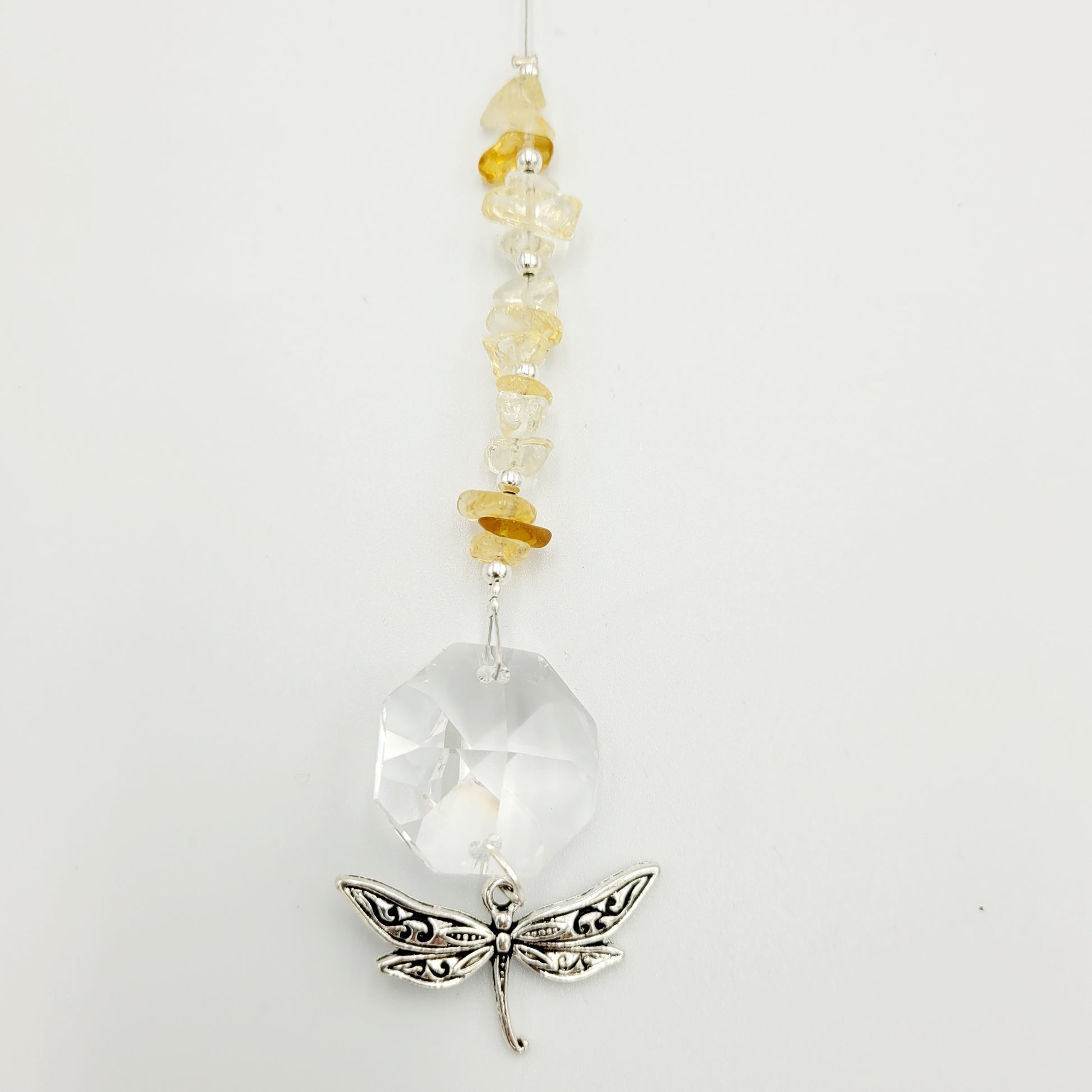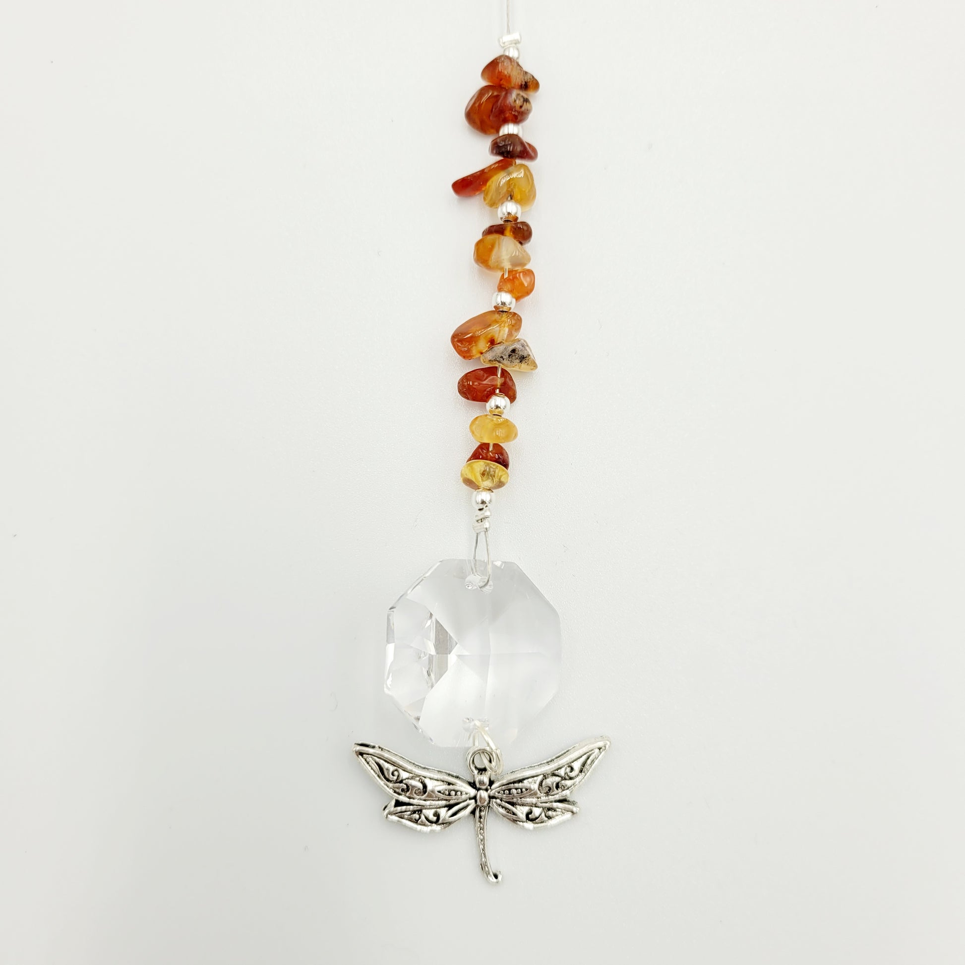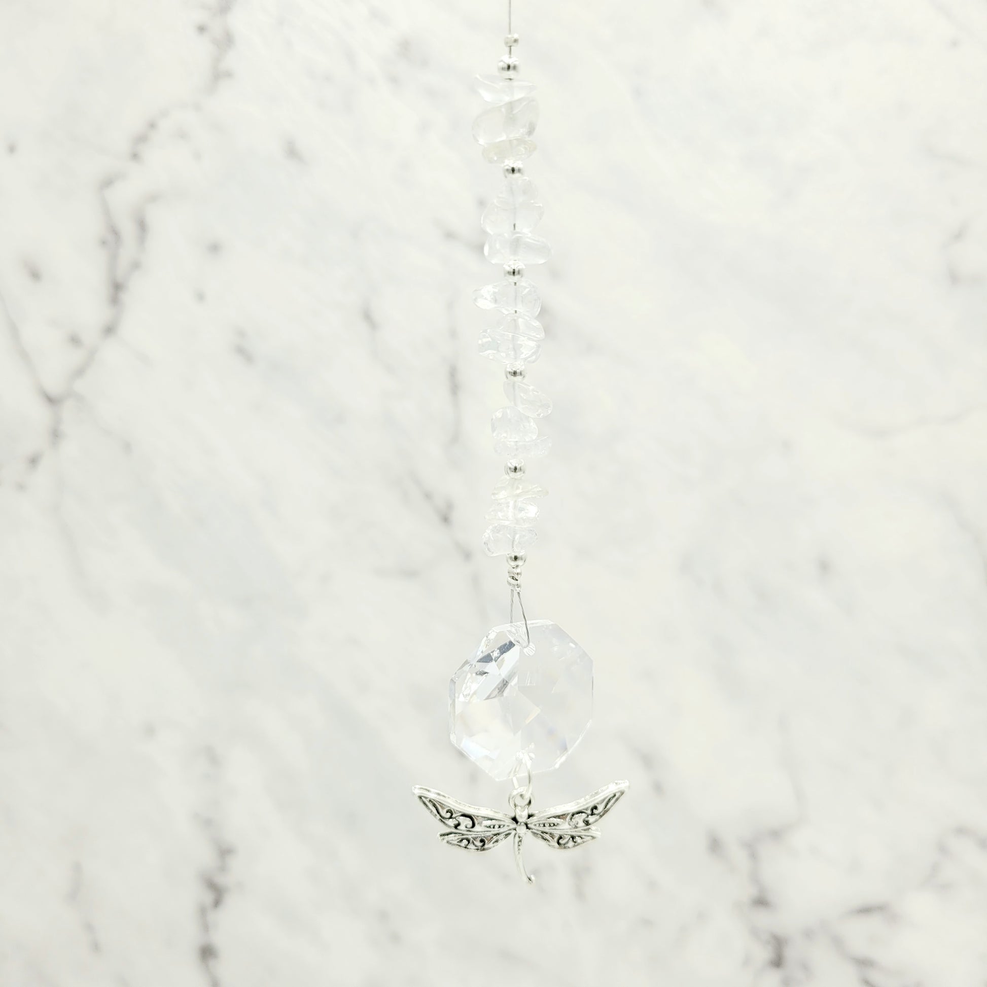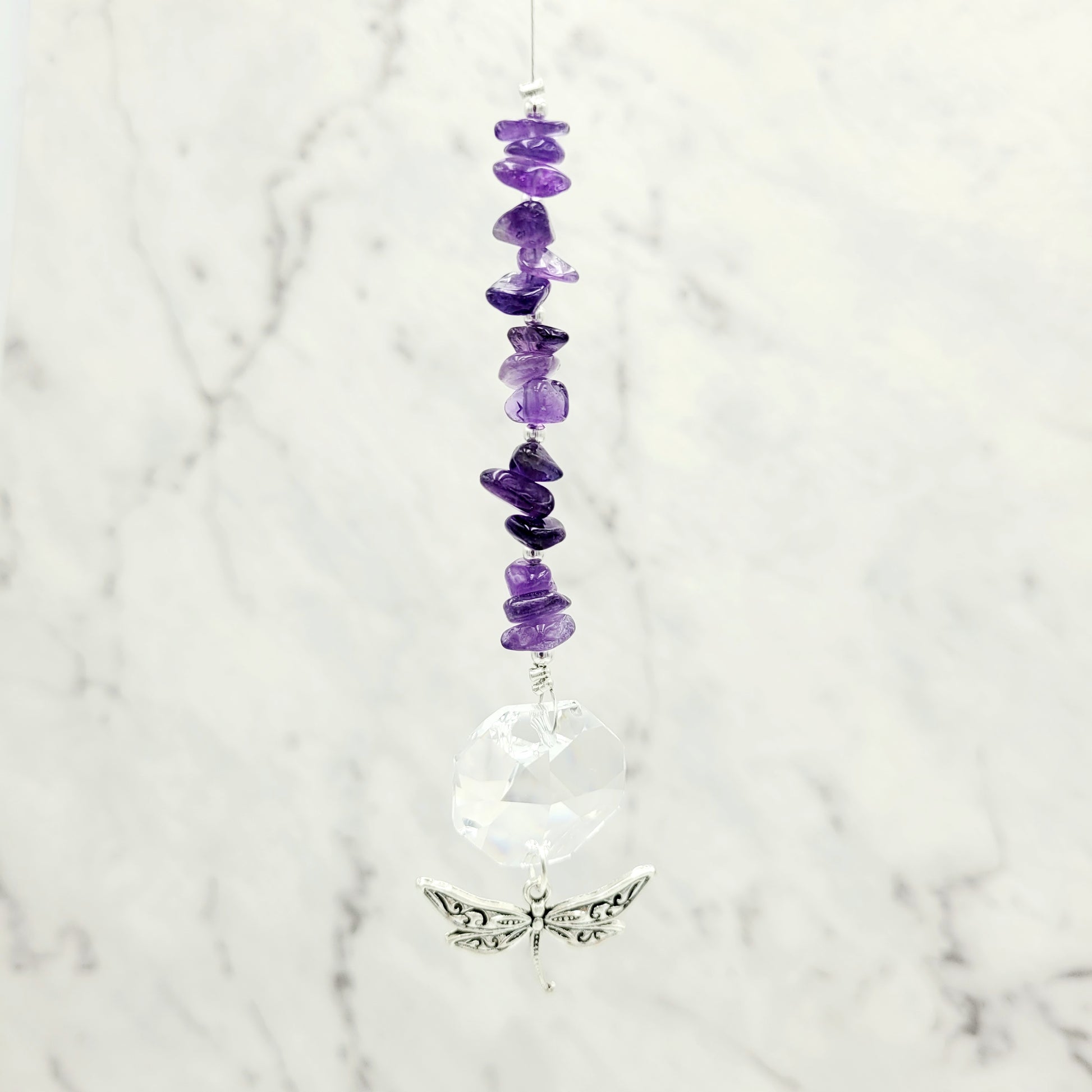 Bring transformation, adaptability, and self-realization to your home with our Dragonfly Octagonal Crystal Charm Suncatcher. Hang this beautiful piece of craftsmanship inside or outdoors and select your favorite stones for your desired purpose. Made with a large teardrop crystal, enjoy its beauty today!