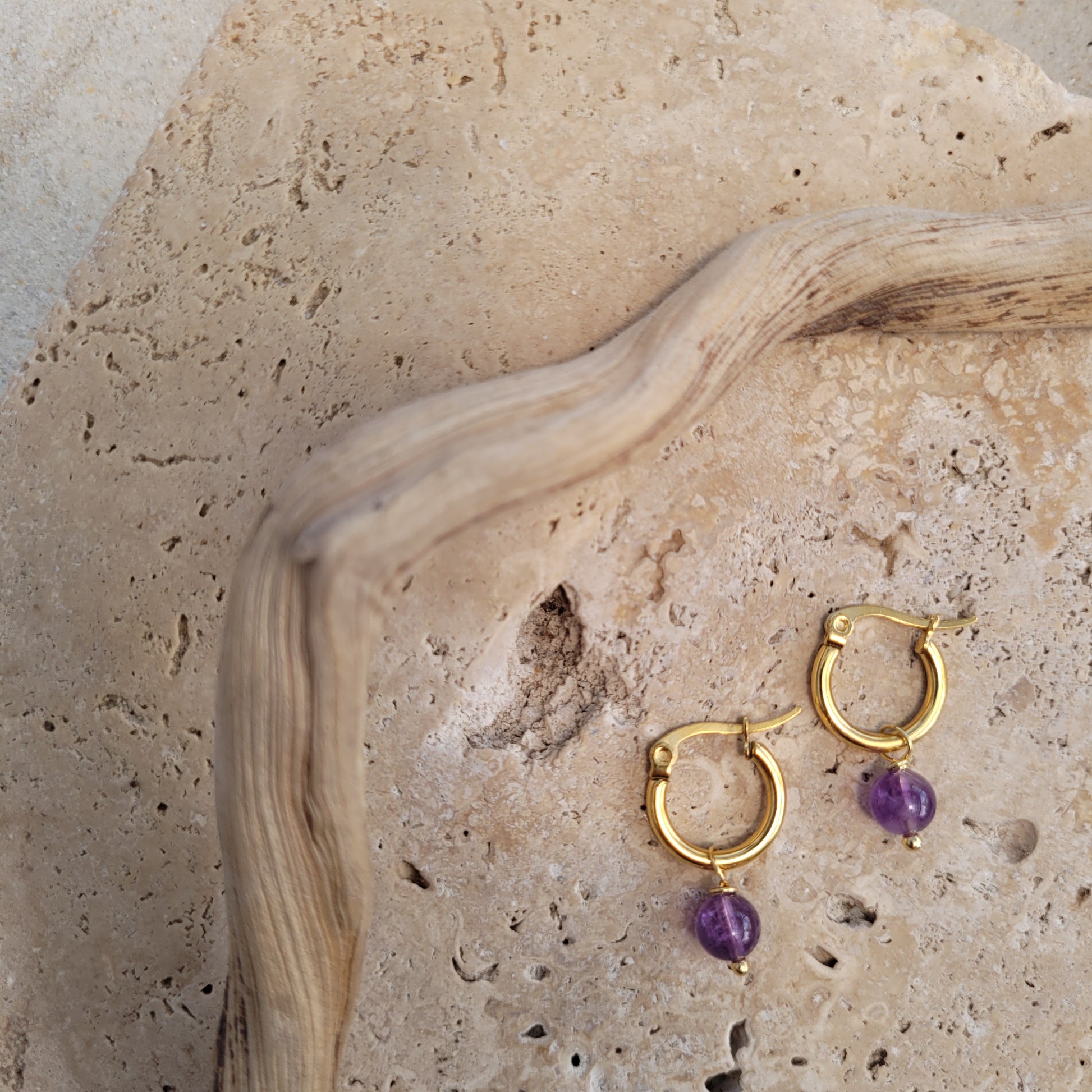 304 Stainless Steel Hoop Earrings, Hypoallergenic, Real 18K Gold Plated, with Amethyts Stone . Show off your unique style with these beautiful earrings. They're built to last with hypoallergenic stainless steel and real, 18K Gold Plating.