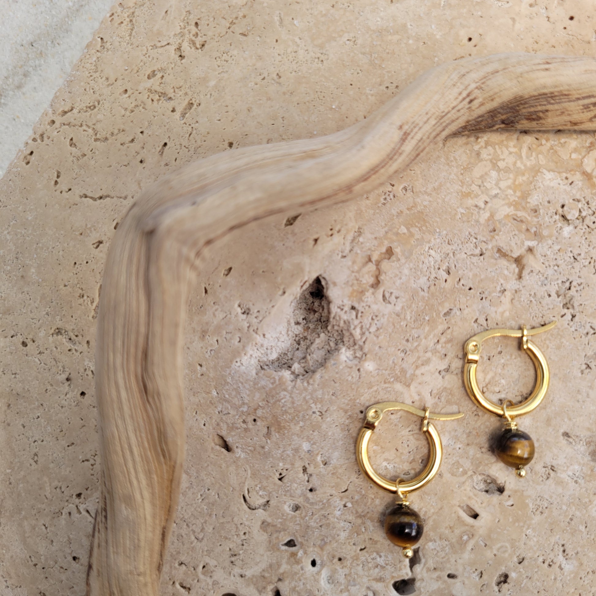 304 Stainless Steel Hoop Earrings, Hypoallergenic, Real 18K Gold Plated, with Tiger eye Stone . Show off your unique style with these beautiful earrings. They're built to last with hypoallergenic stainless steel and real, 18K Gold Plating.