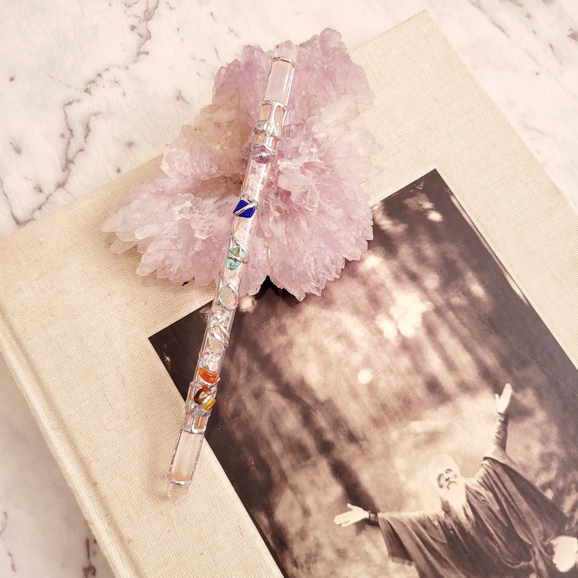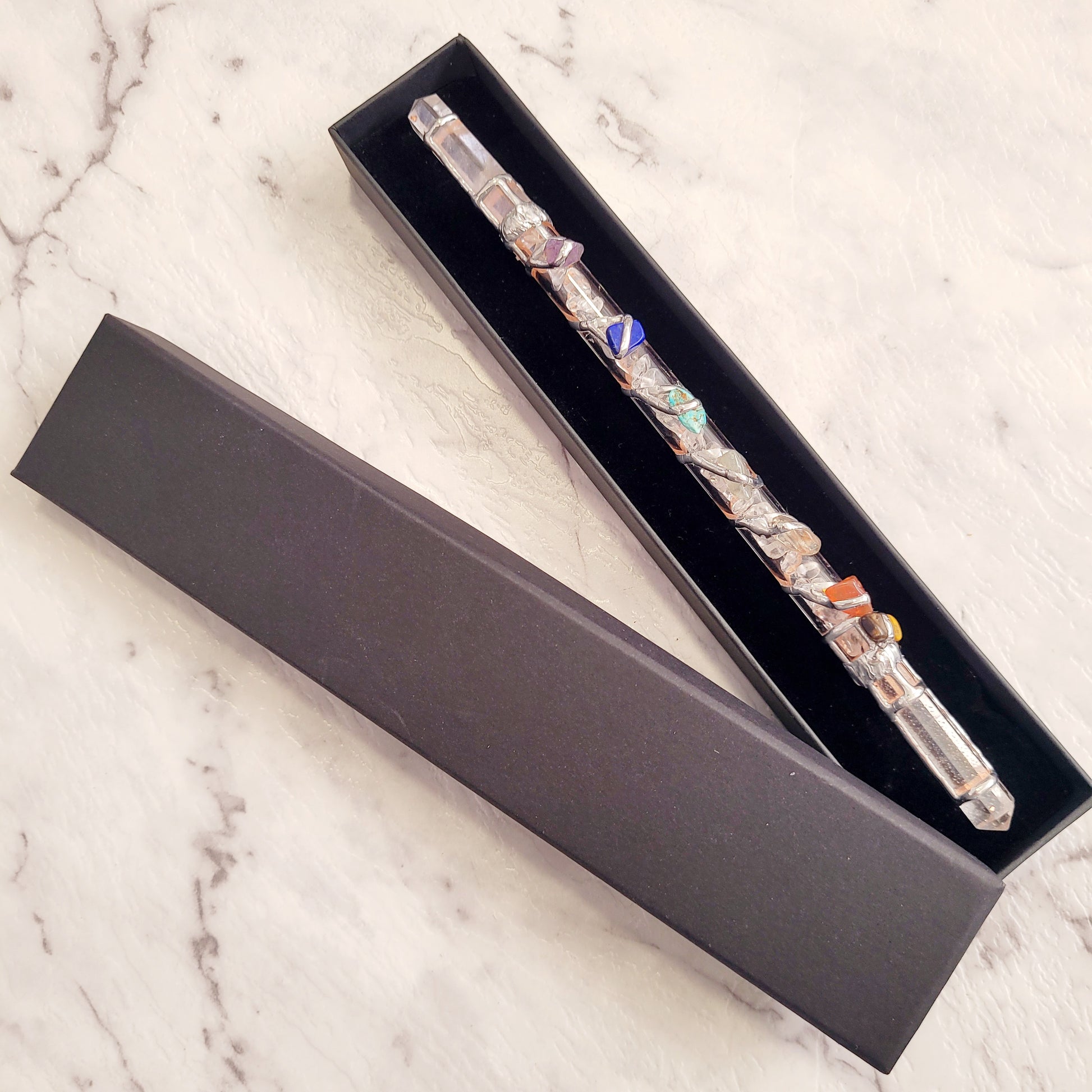 Our Chakra Balance Wand is designed to help you achieve a balanced, healthy lifestyle. Made with Carnelian, Tiger Eye, Citrine, Aventurine, Sodalite, Amathyst and Clear Quartz, its purpose is to regulate and balance the energy fields of the chakras for improved wellbeing. With regular use, you can expect improved focus, reduced stress, and a sense of peace.