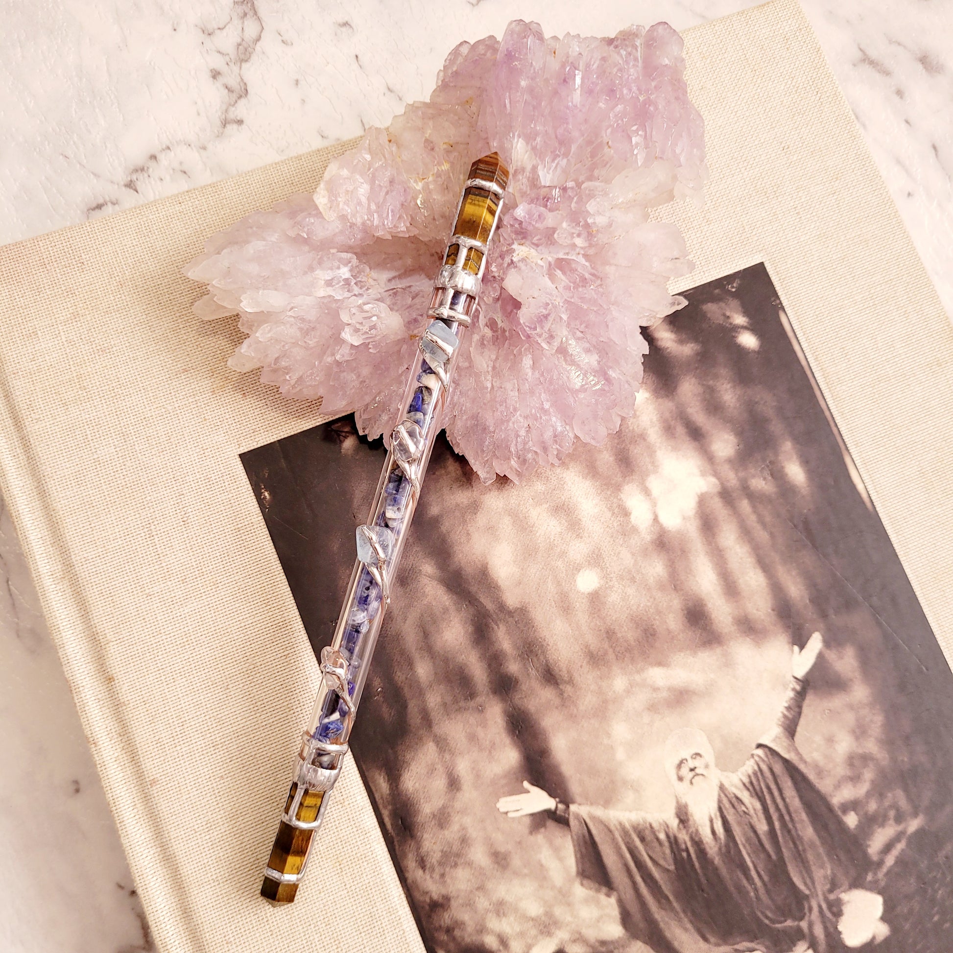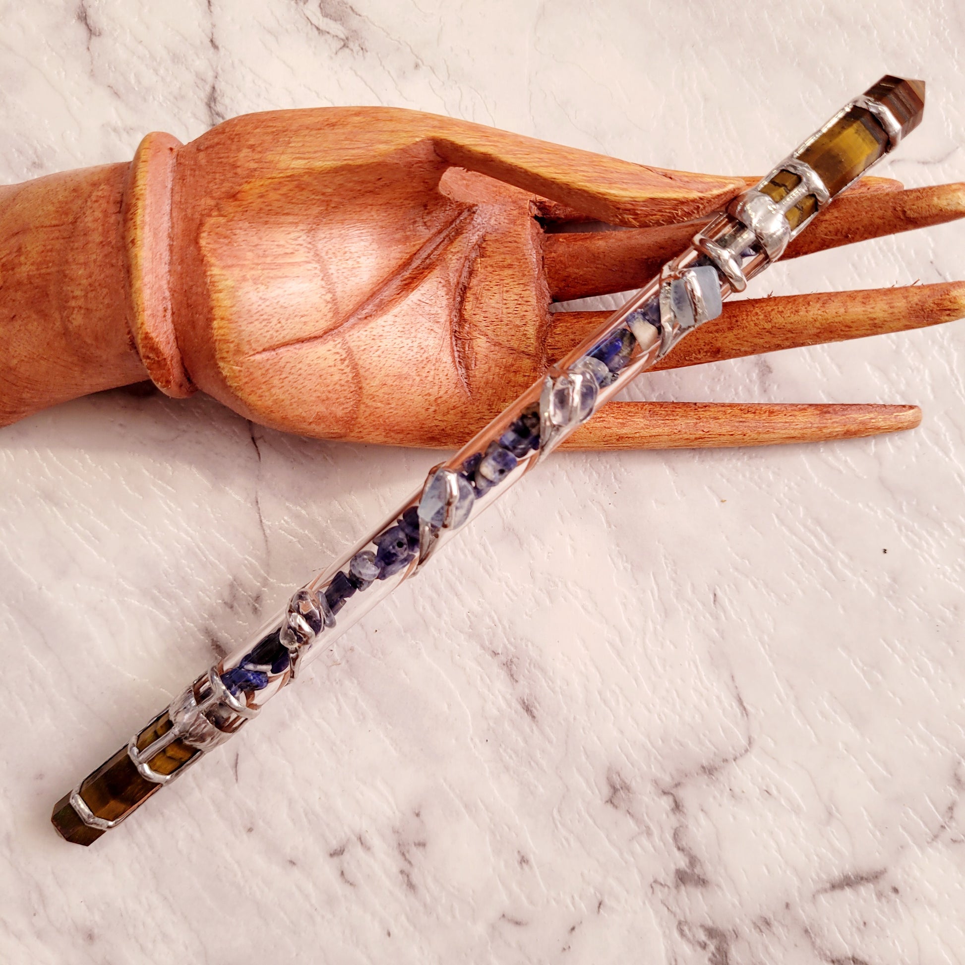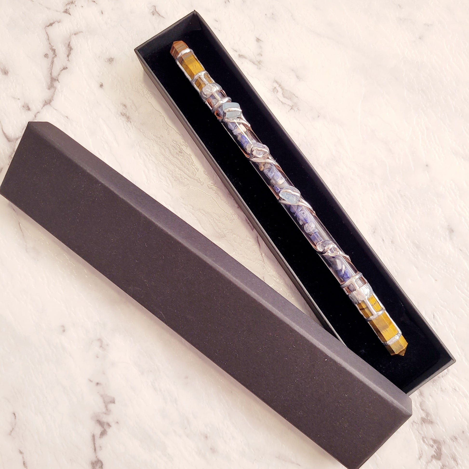 The Clarity Wand is the perfect tool to achieve deeper insight. Crafted with pristine stones including Sodalite, Tiger Eye, Clear Quartz and Aquamarine, these crystals tap into the power of the 5th, 6th and 7th Chakras to strengthen clarity and truth, while enhancing perception and insight. With the addition of Clear Quartz, this wand amplifies balance and dispels any negativity. Experience a heightened state of understanding with this luxurious tool.