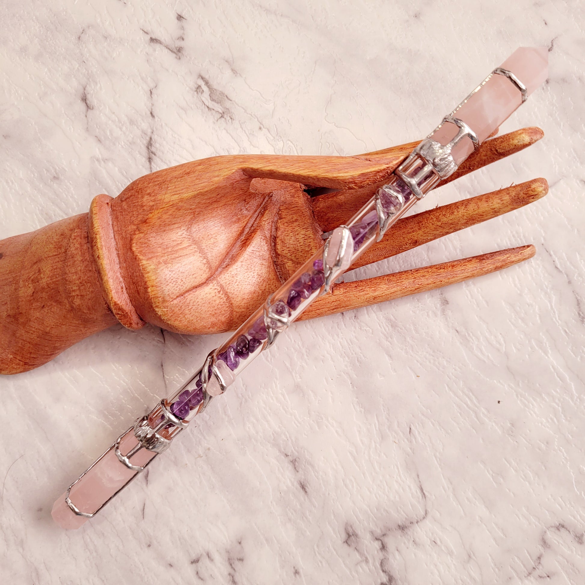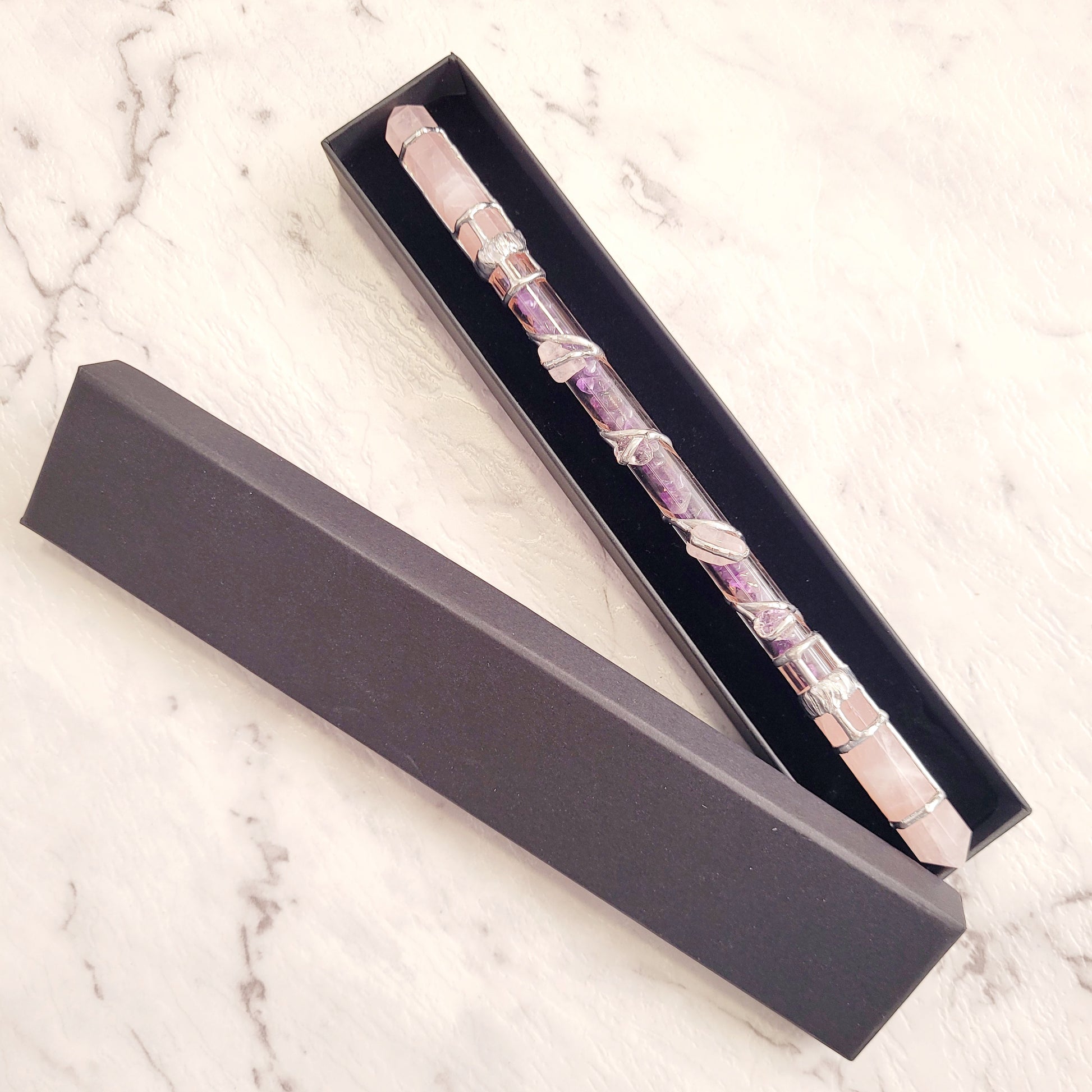 As the name suggests, our double point wands are accentuated using with a premium crystal point on each end. Its delicate design provides an elegant touch to any healing session, while retaining an unmistakable power that can be directed to both disperse and draw energy as desired.