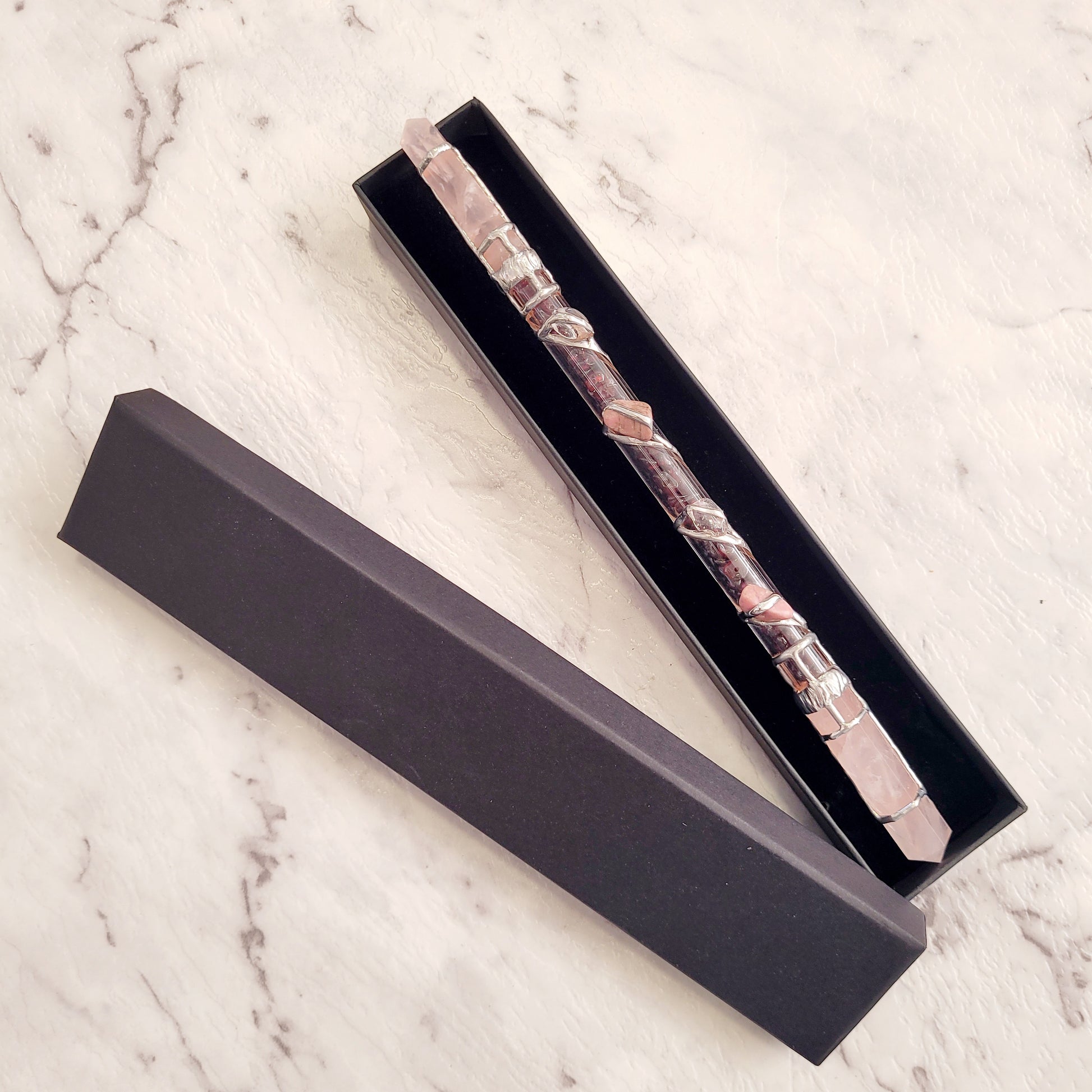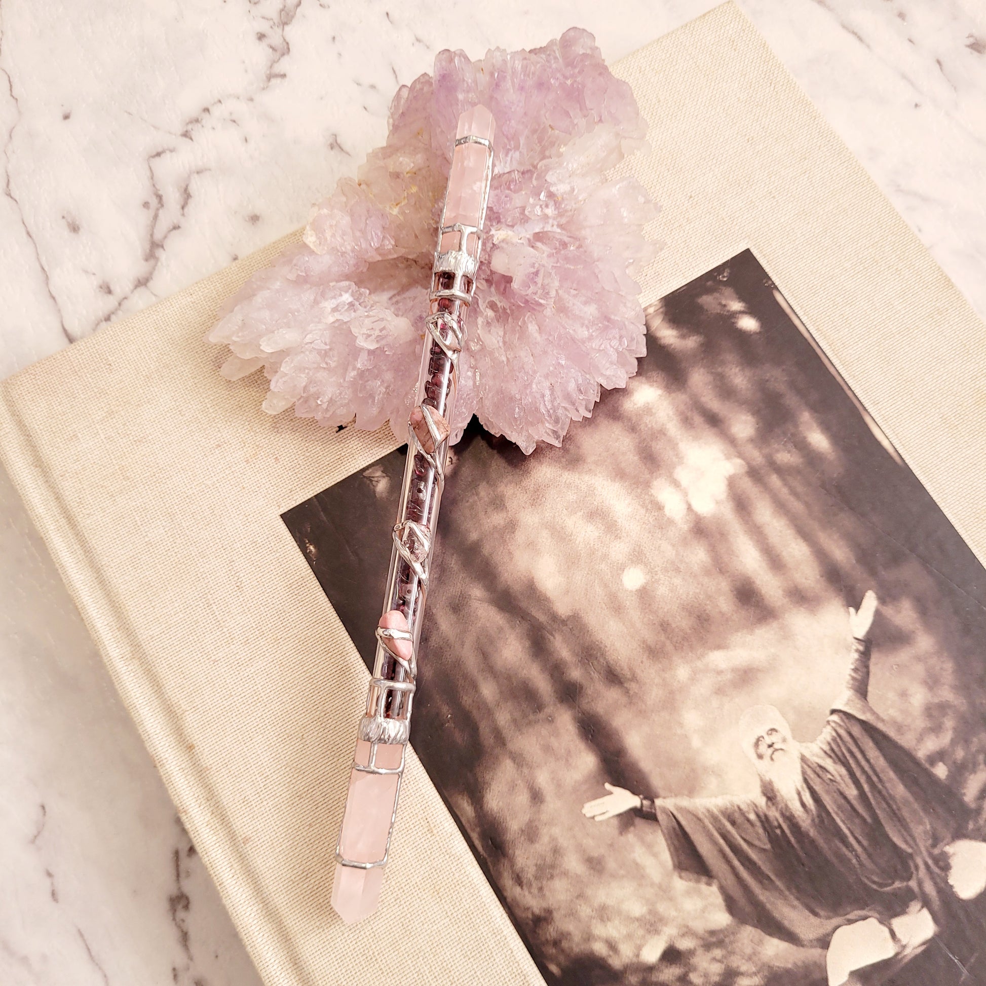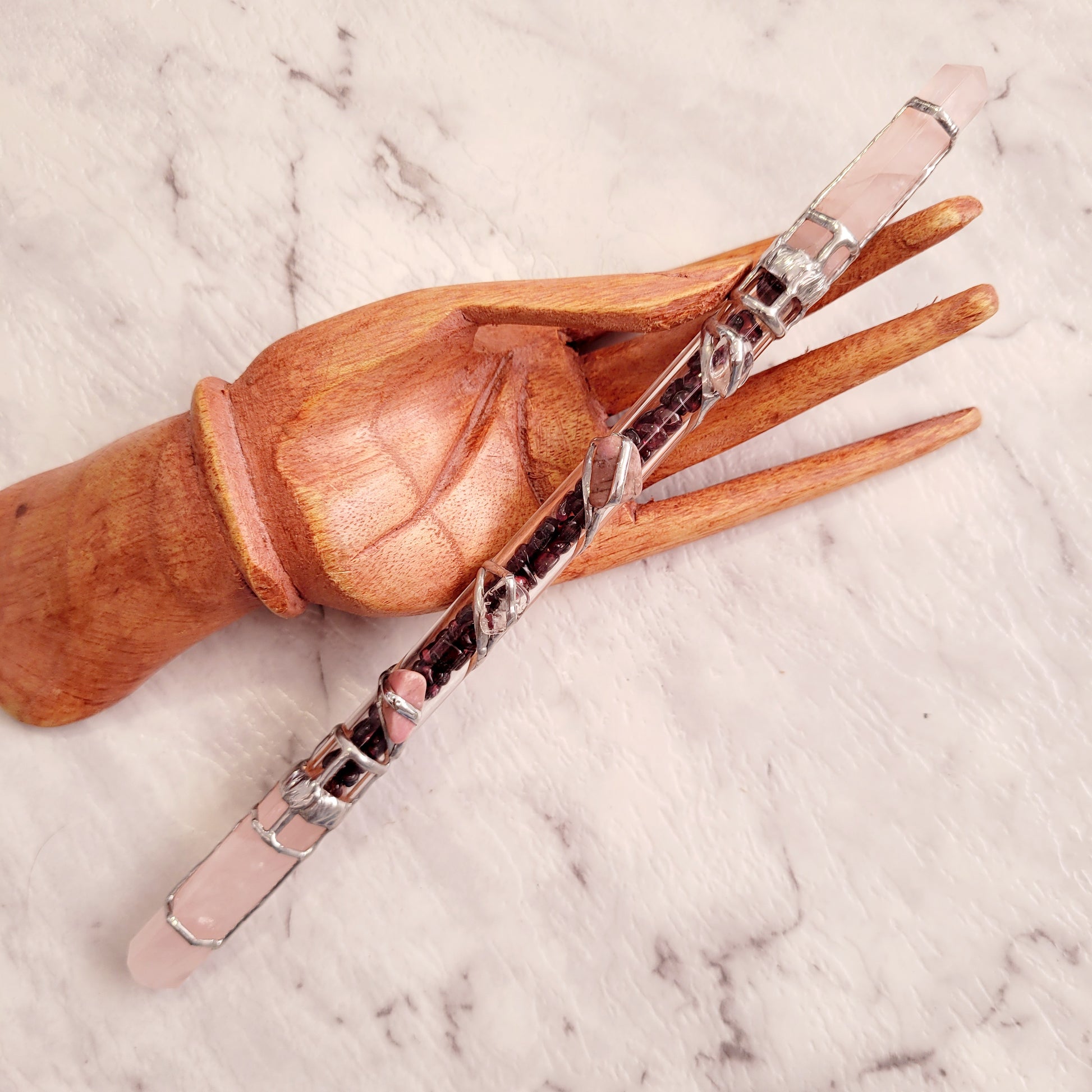 Experience the joy of true passion and creativity with this unique Passion Wand. Crafted with Rose Quartz, Rhodonite, Garnet and Clear Quartz, this wand unites your heart and sexuality, while Garnet helps you express your love and passion. Rose Quartz and Rhodonite work together to help heal and remove any blocks, so your true self can shine.
