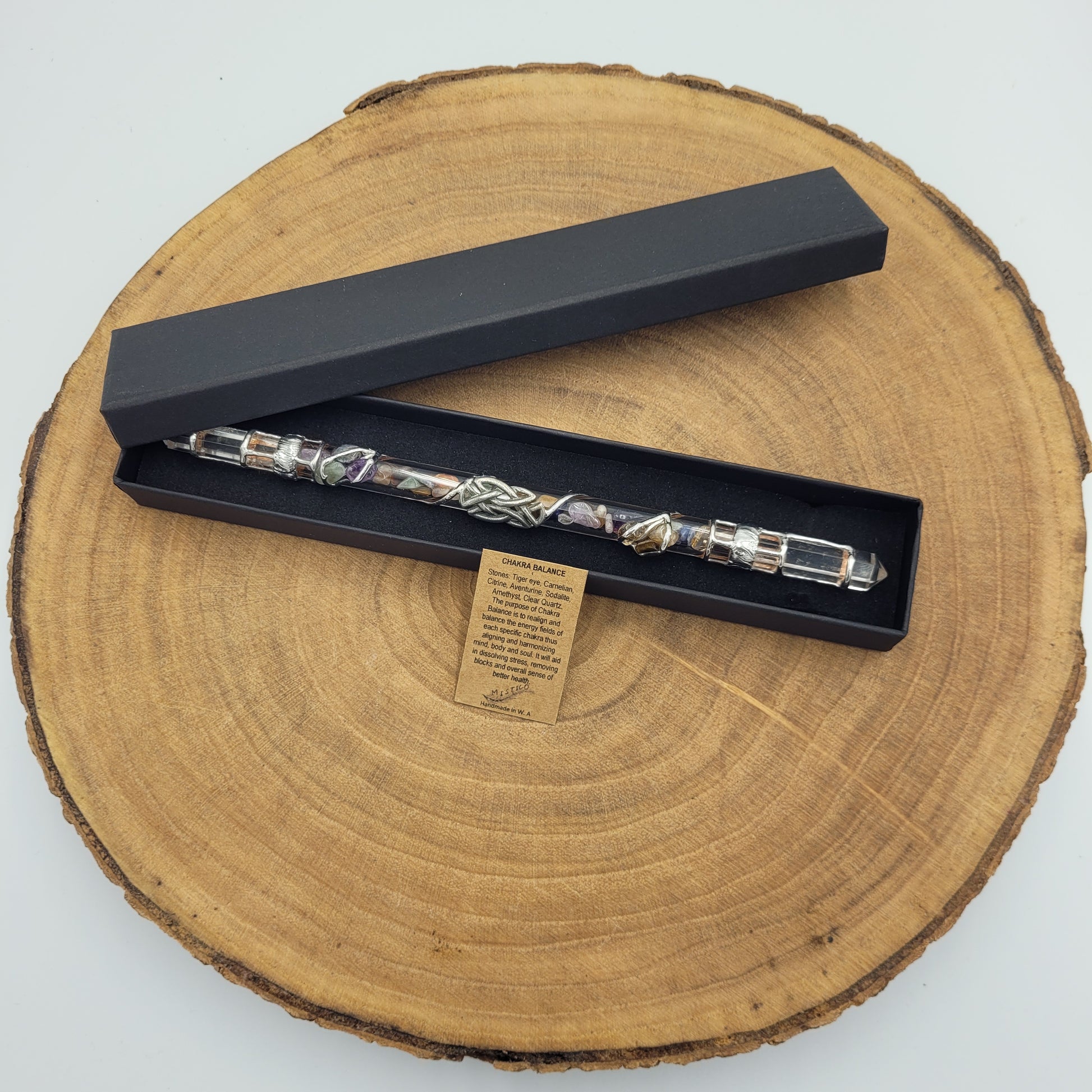 Experience power and protection with this beautiful Pentagram Wand. Wrapped with clear quartz to amplify your thoughts and energy, this wand will actively stimulate positive feelings. Guard yourself from evil and negative influence with the protection of the Pentagram.