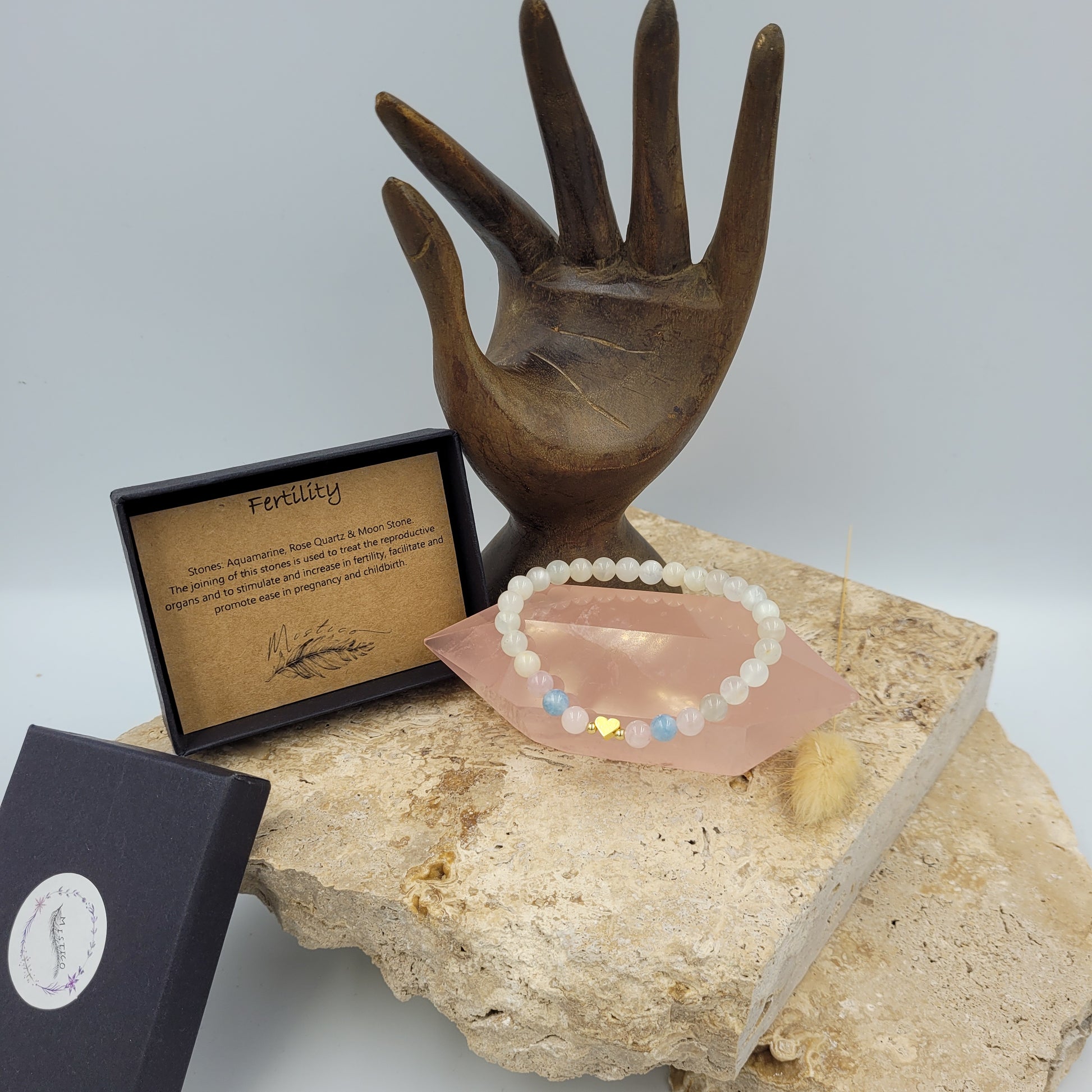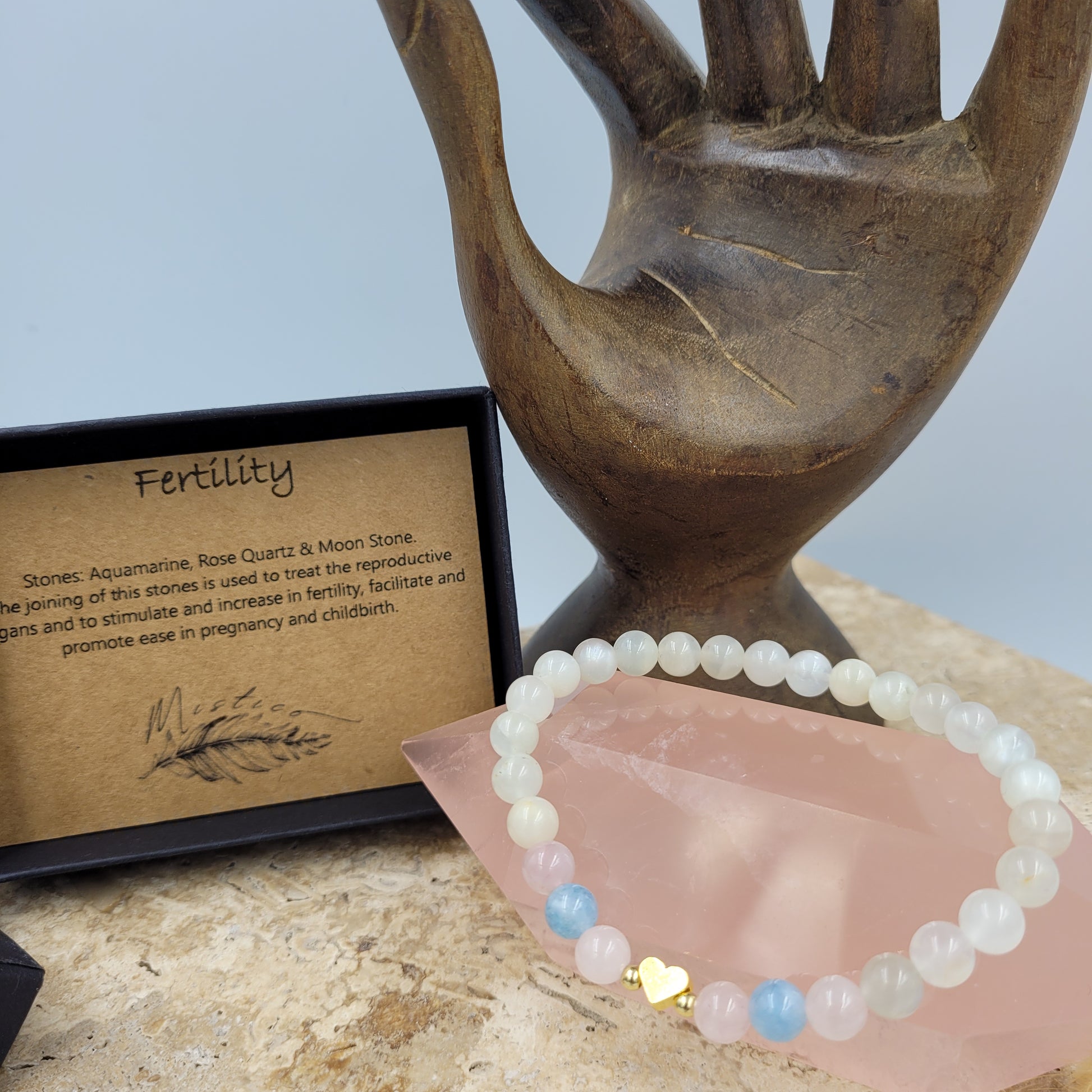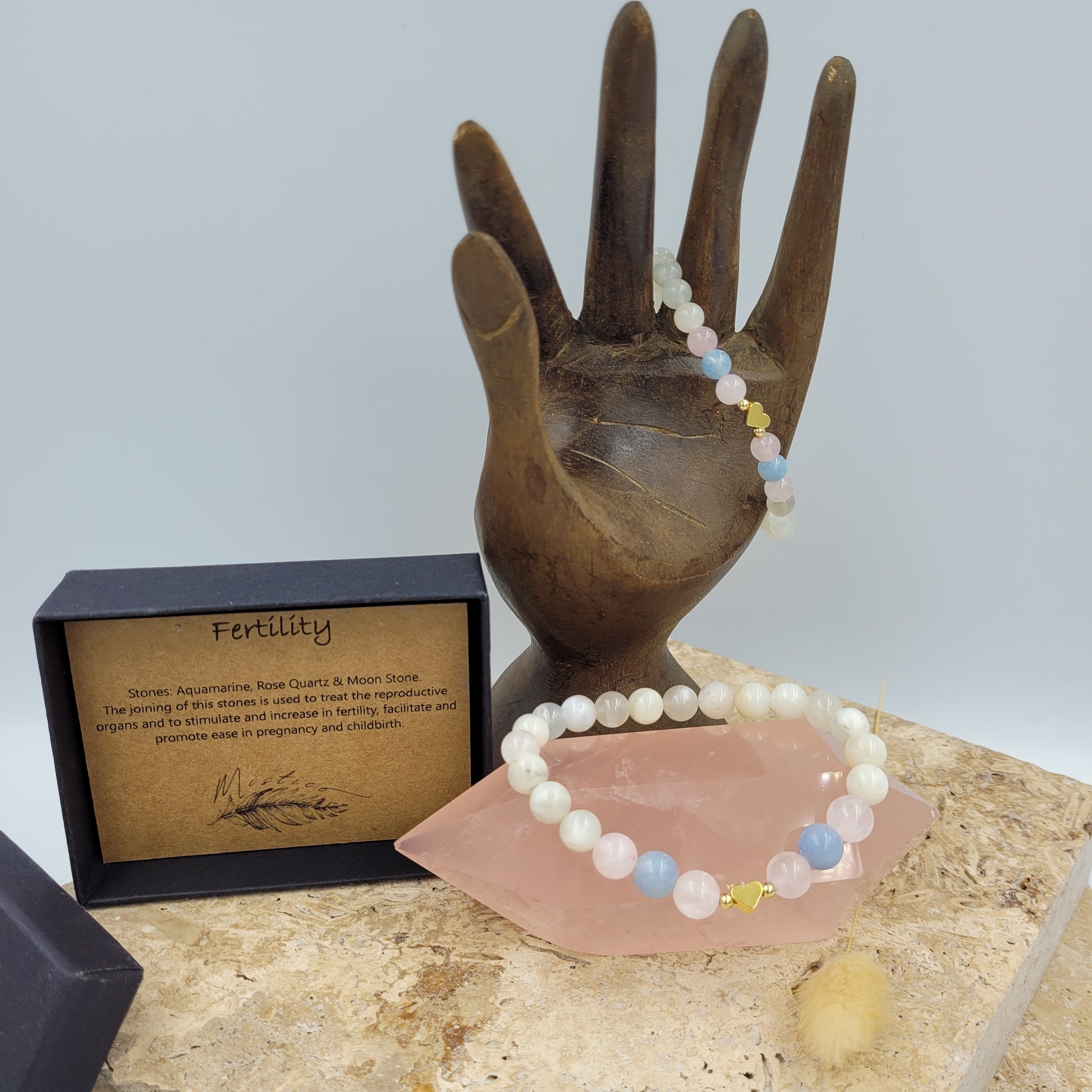 This Fertility featuring Rose Quartz, Aquamarine & Moon Stone, is designed to support fertility. The special combination of healing crystals helps regulate hormones responsible for fertility and promotes ease in pregnancy and childbirth.