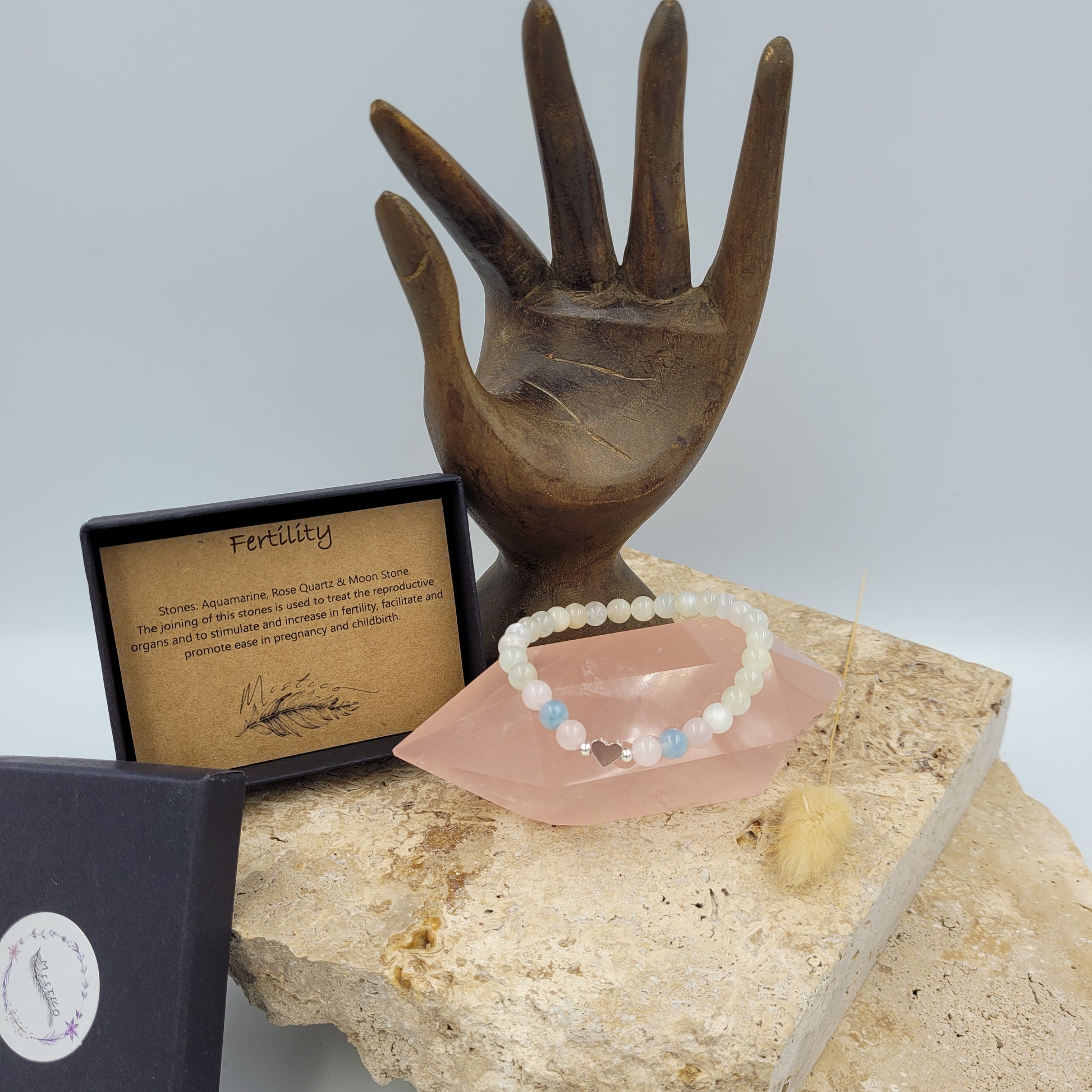 This Fertility featuring Rose Quartz, Aquamarine & Moon Stone, is designed to support fertility. The special combination of healing crystals helps regulate hormones responsible for fertility and promotes ease in pregnancy and childbirth.