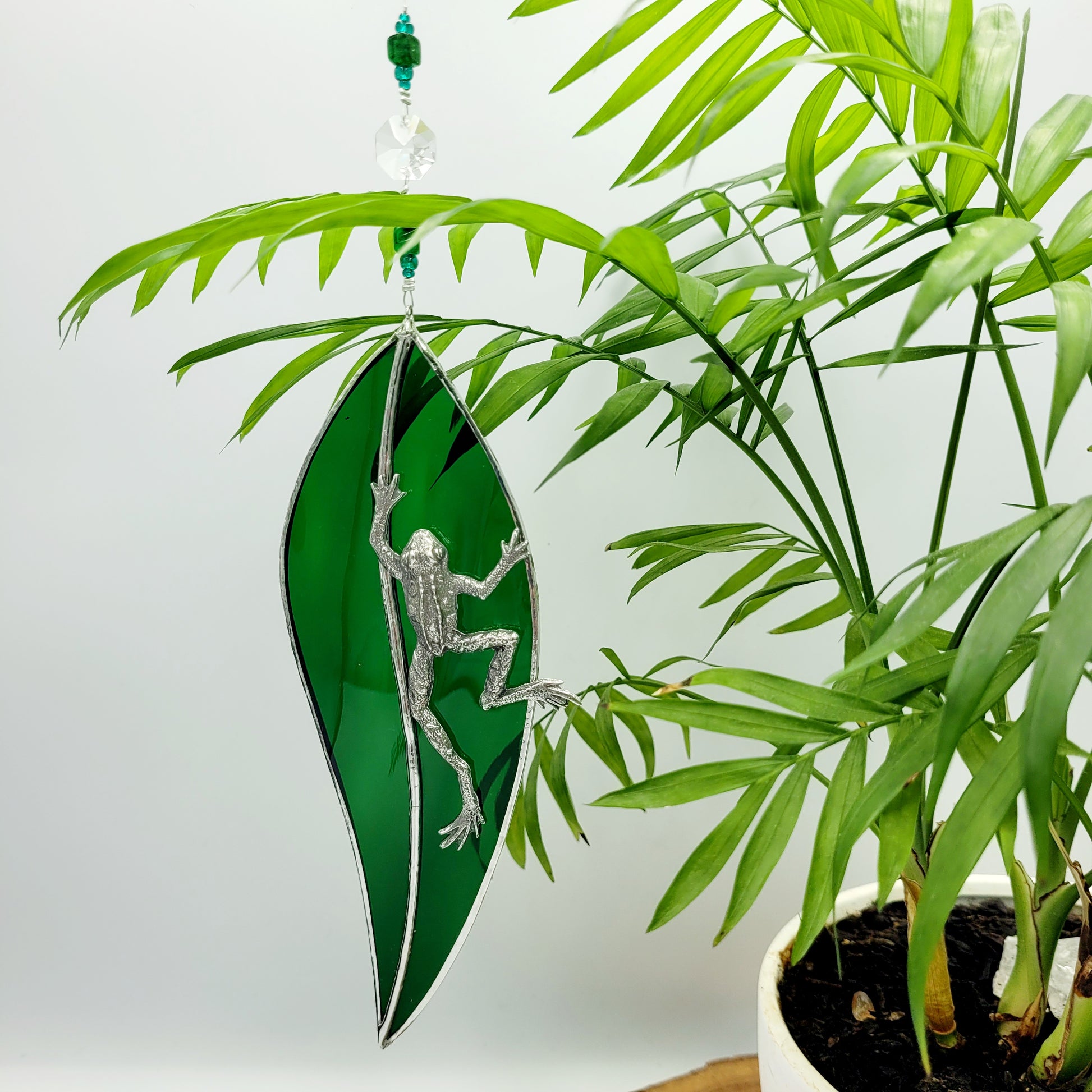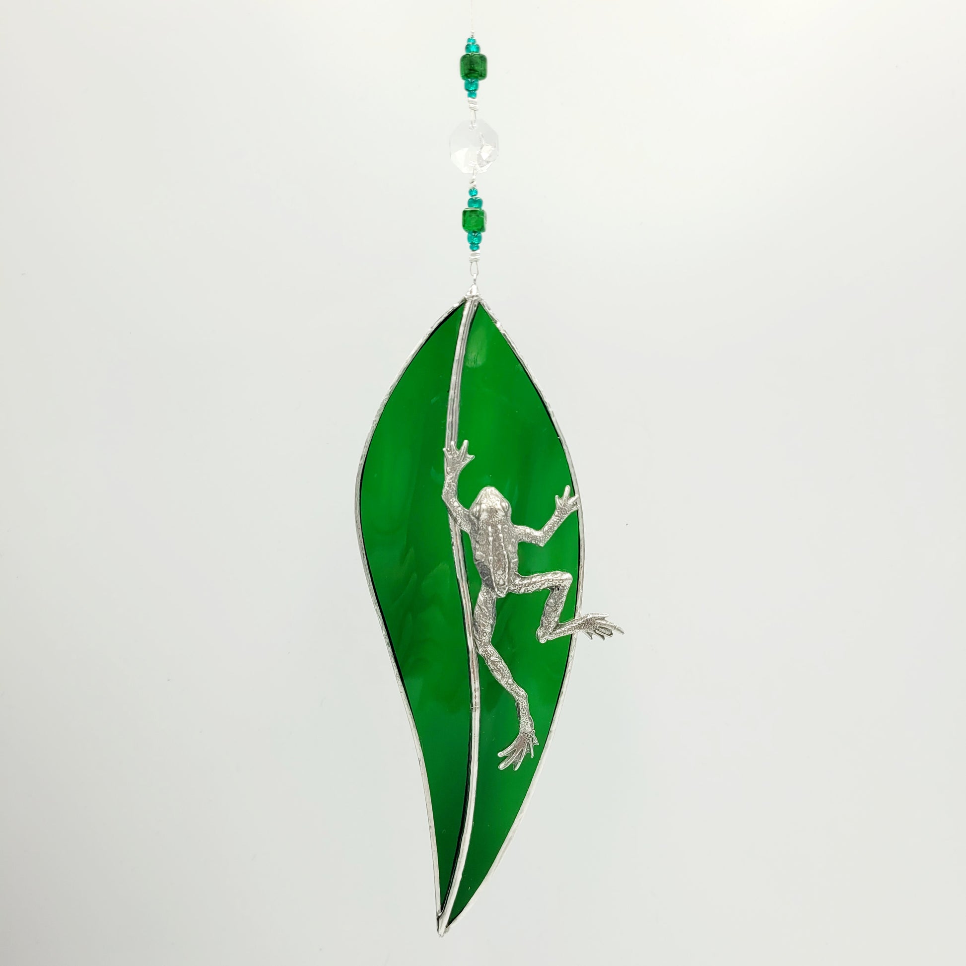 Hanging Stained Glass Large Leaf Dark Green /Frog