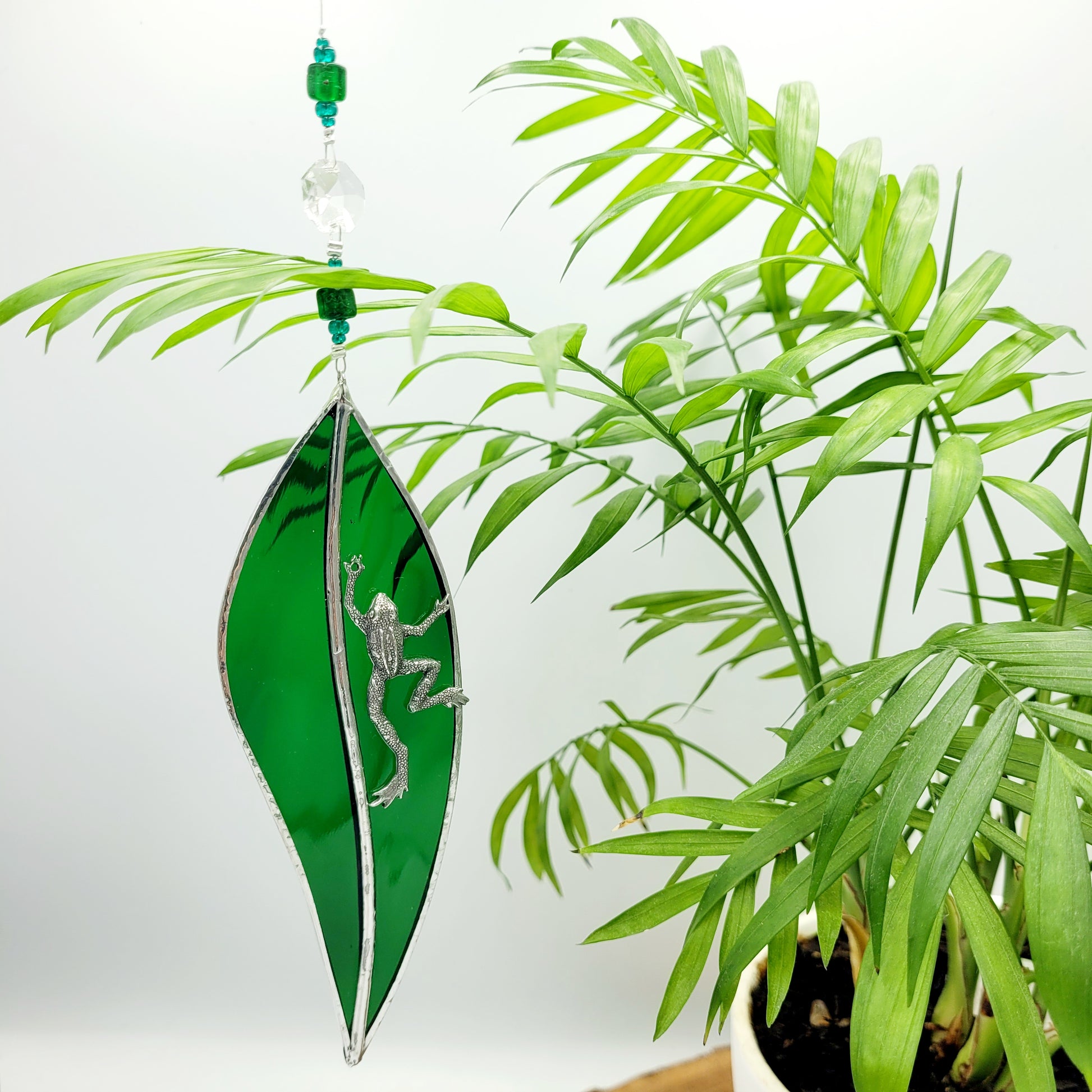 Hanging Stained Glass Small Leaf Dark Green / Frog