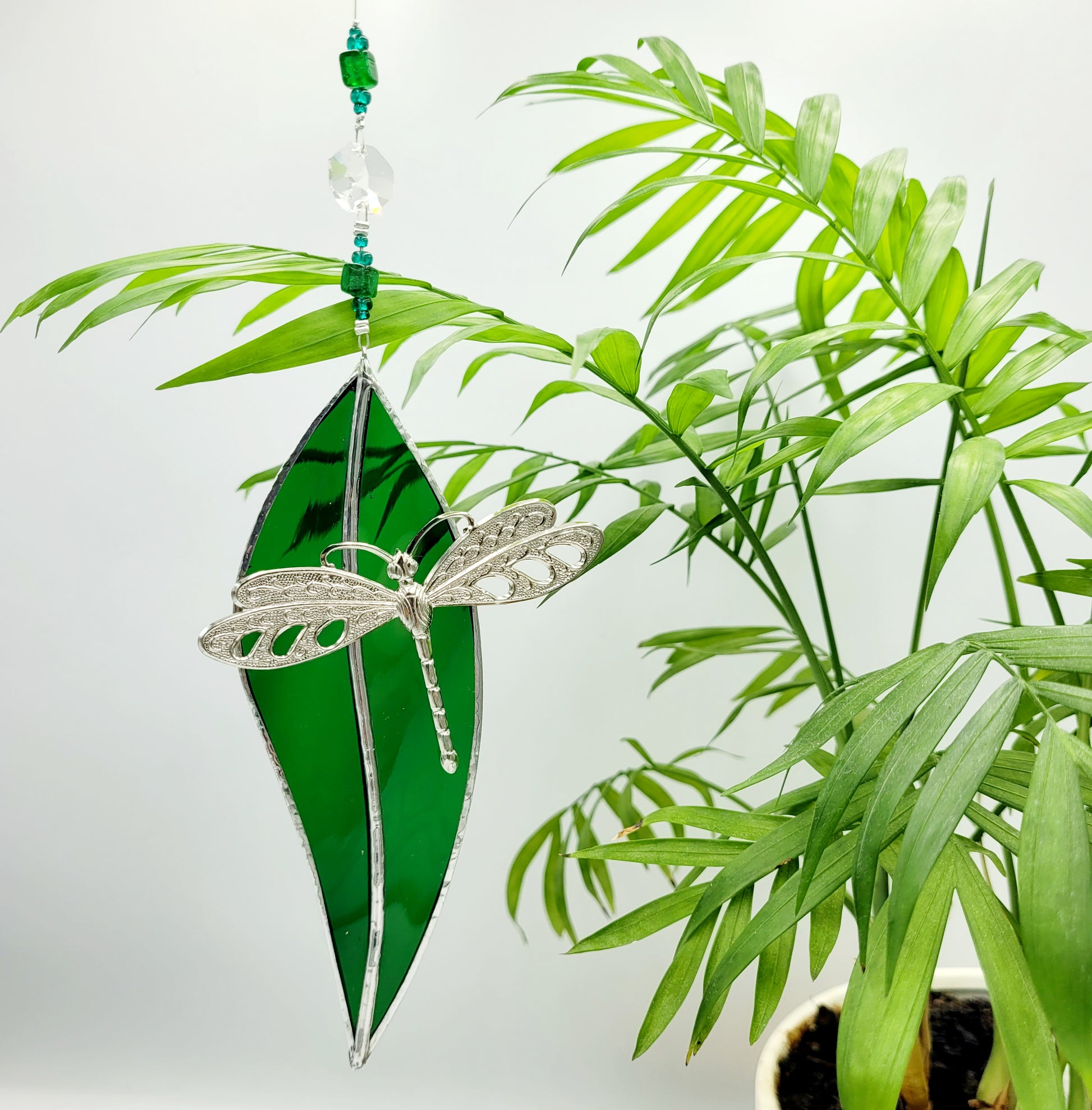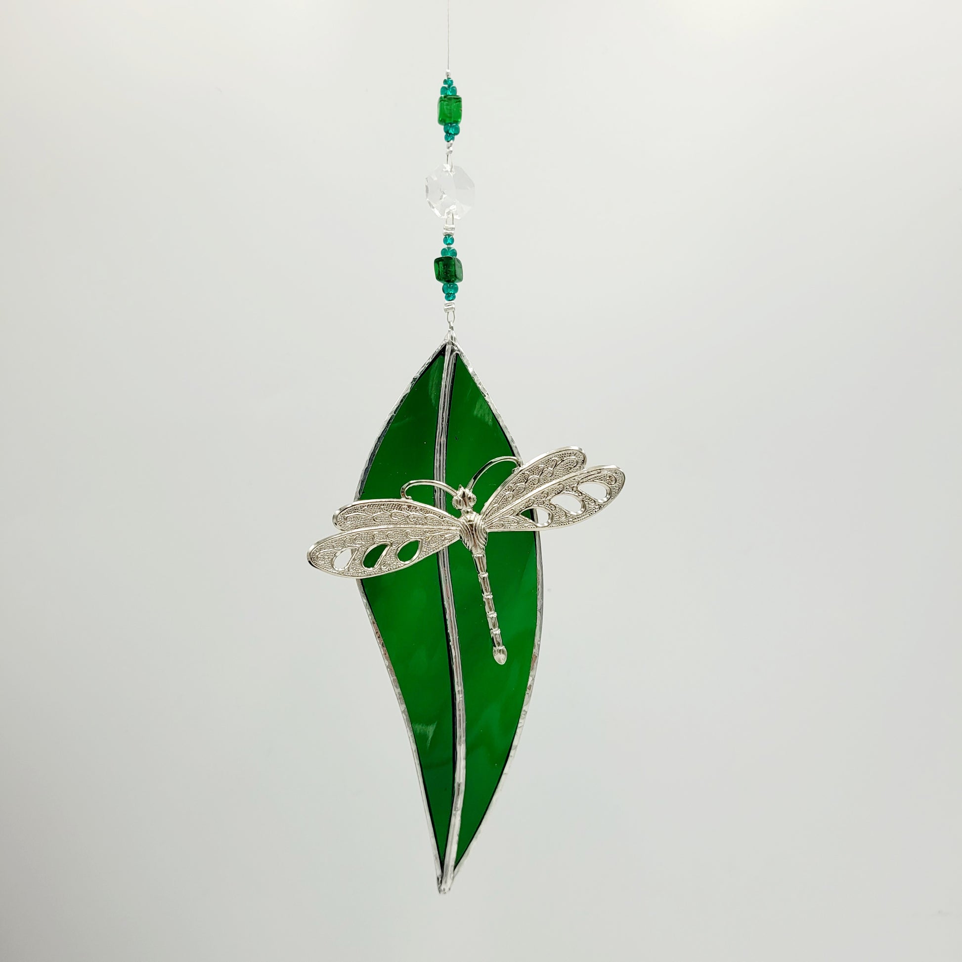Hanging Stained Glass Small Leaf Dark Green/ Dragonfly