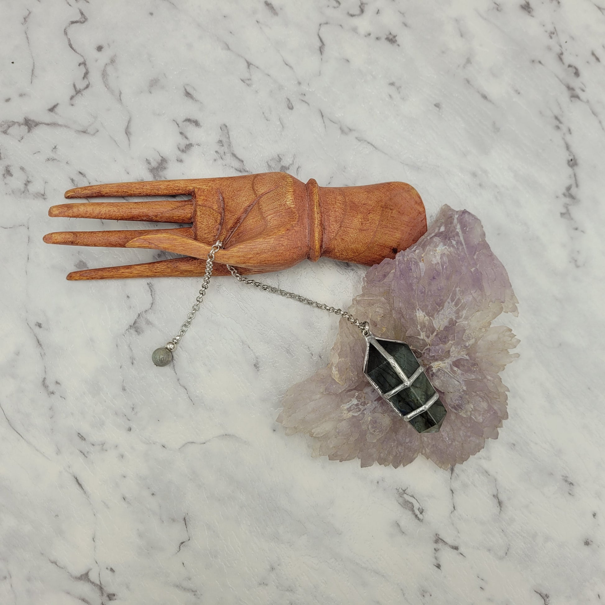 Experience an elevated sense of tranquility with our Large Calming Pendulum. Crafted from labradorite, this pendulum helps to center the mind and create positive energy, allowing you to access inner strength and resilience. Let it be your companion in moments of need.