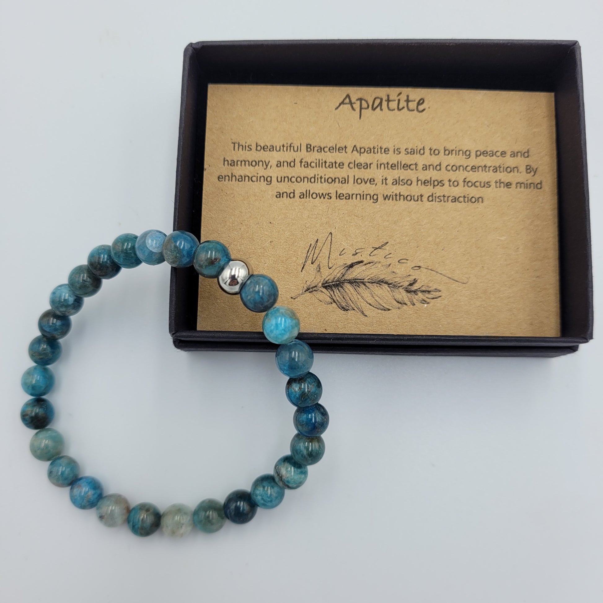 This beautiful Bracelet Apatite 8mm is the perfect blend of fashion and function. Crafted with natural 8mm apatite stones, it is said to bring peace and harmony, and facilitate clear intellect and concentration. By enhancing unconditional love, it also helps to focus the mind and allows learning without distraction.