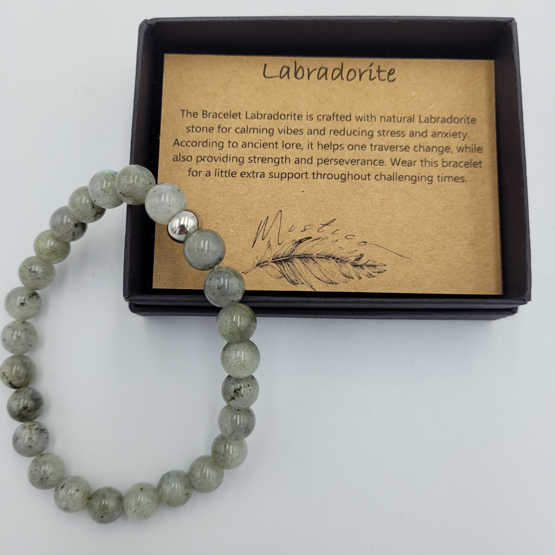 This Men's Bracelet is made with natural Labradorite stones that provide energy for strength and courage during difficult times. Crafted with 8mm stones, its calming vibes are believed to help traverse changes according to ancient lore.
