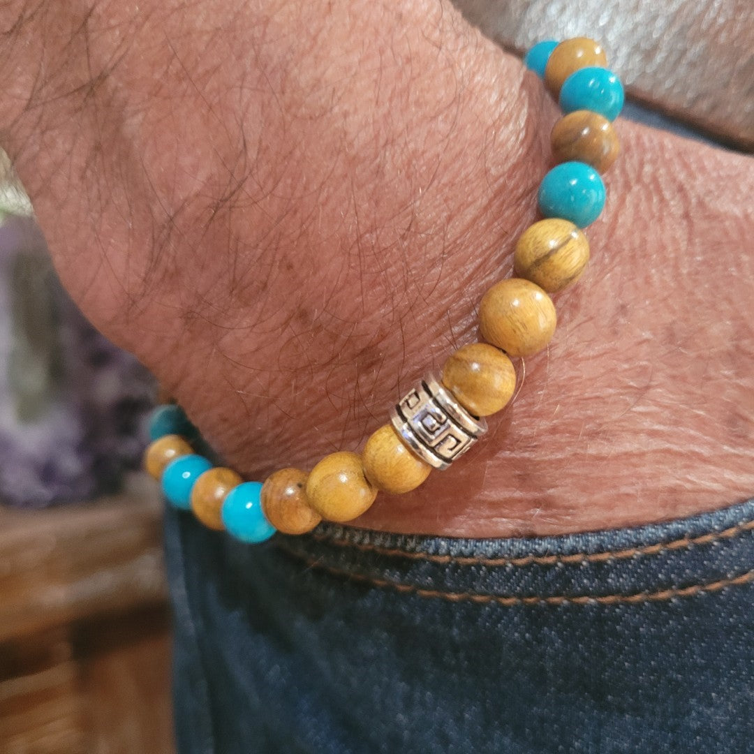 Elevate your style with our Men's Bracelets! Featuring a combination of 8mm. turquoise and wood, these bracelets make a bold statement while providing a sense of grounding and stability. Experience the unique benefits of both materials, from the calming energy of turquoise to the strength of wood. Elevate your style and energy with our bracelets!
