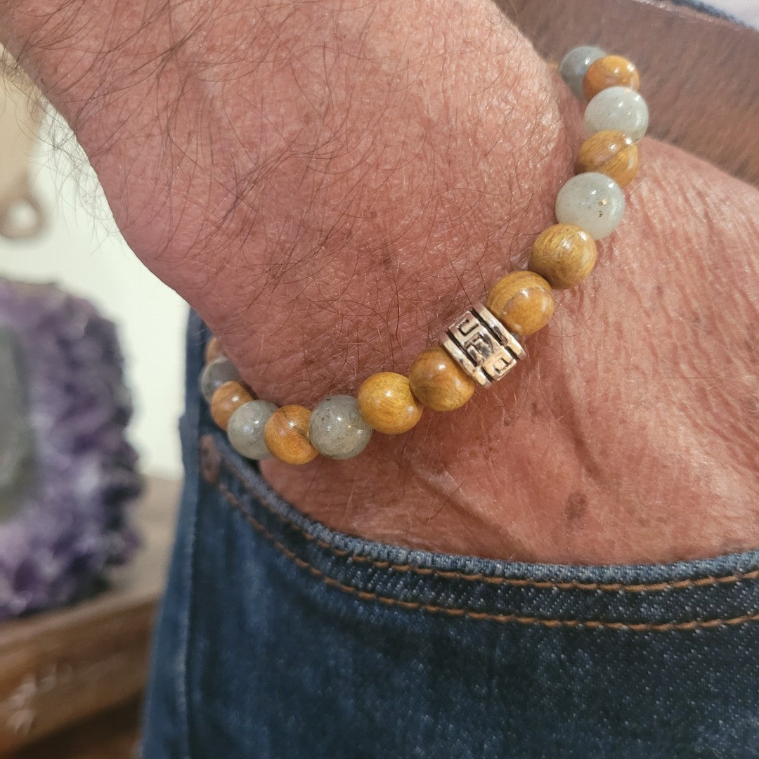 Elevate your style with our Men's Bracelets Wood & Labradorite. The earthy labradorite stones and natural wood beads add a unique touch to this 8mm men's bracelet. Feel confident and effortlessly stylish with this statement piece.