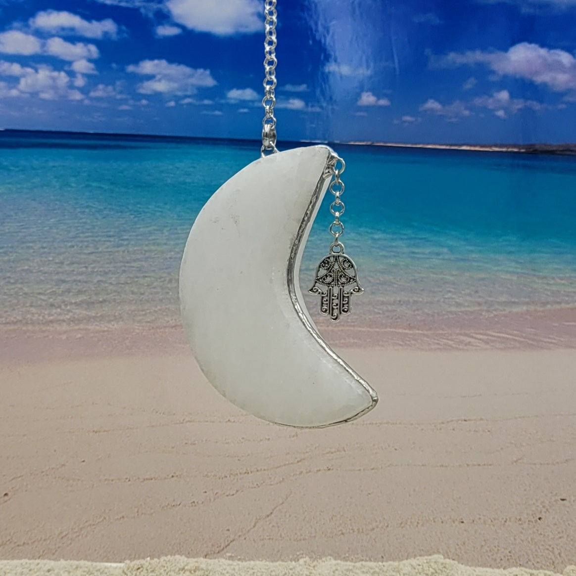 The Moon Selenite Hanging is a powerful, spiritual aid crafted from selenite stone that helps you access angelic consciousness. With it, you can enjoy the calming effects of mediation and deepen your spiritual practices. Selenite is also said to radiate energy to amplify your meditation and prayer journeys.