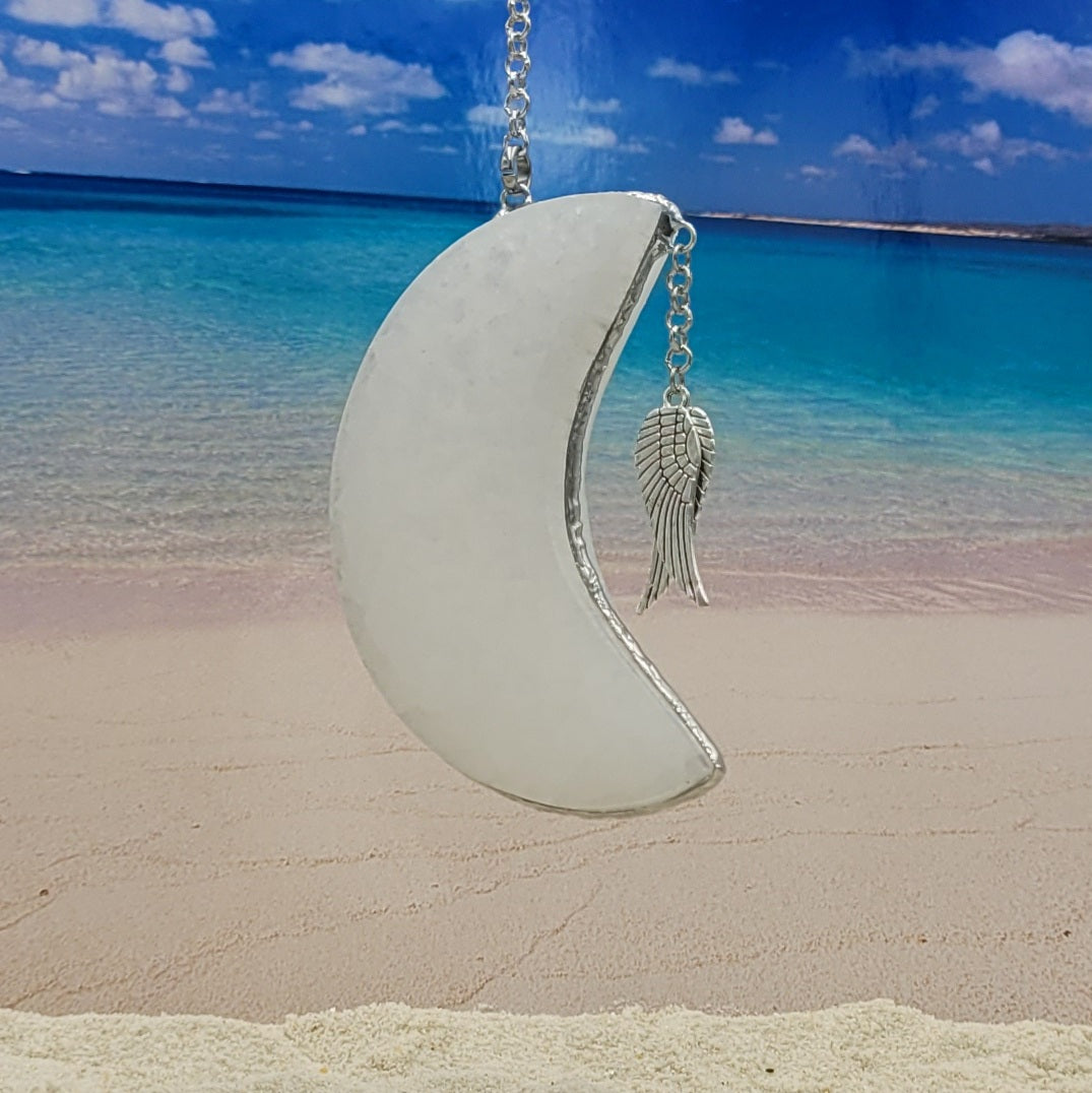 The Moon Selenite Hanging is a powerful, spiritual aid crafted from selenite stone that helps you access angelic consciousness. With it, you can enjoy the calming effects of mediation and deepen your spiritual practices. Selenite is also said to radiate energy to amplify your meditation and prayer journeys.