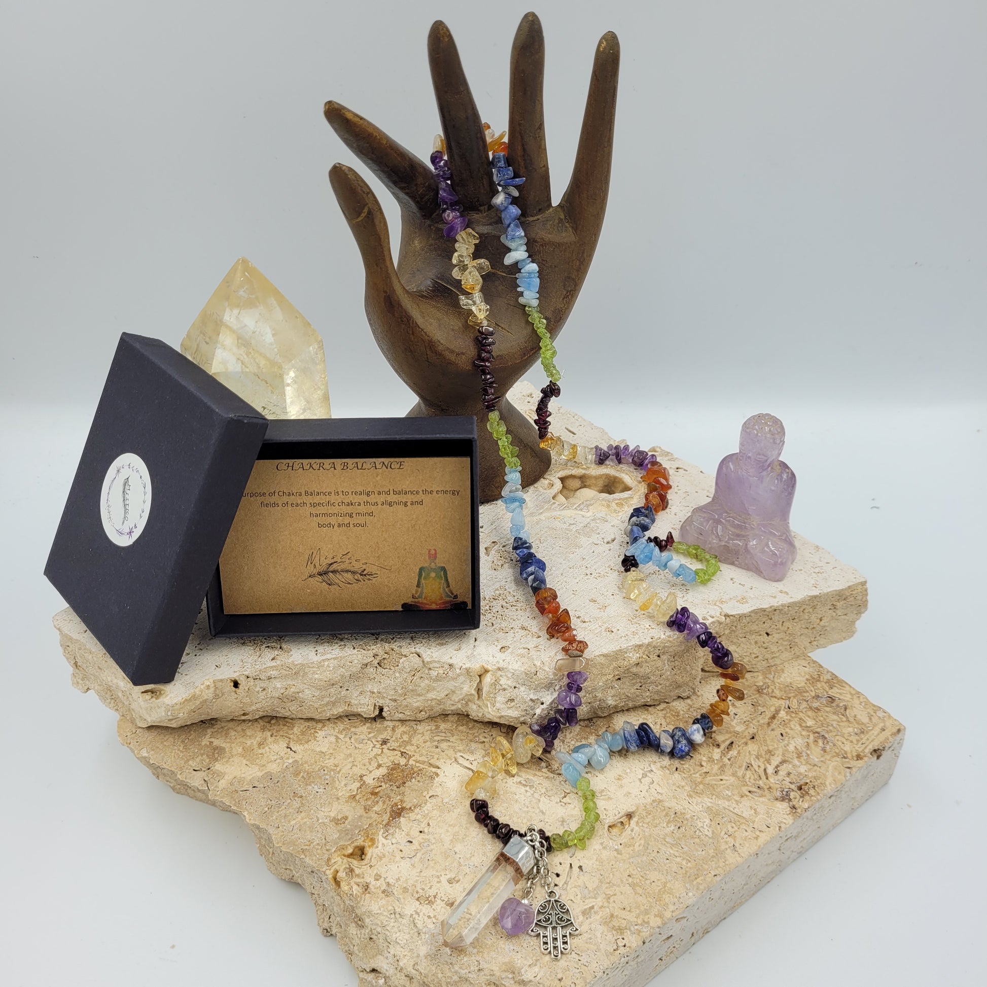 Chakra Balance Necklace with Clear Quartz- Hamsa