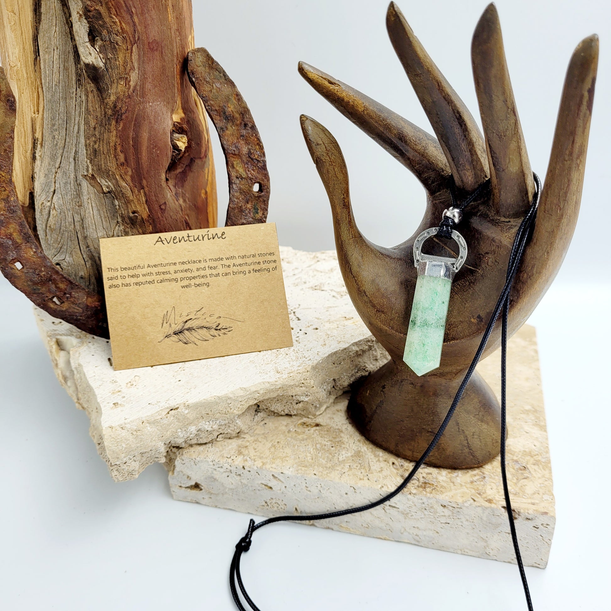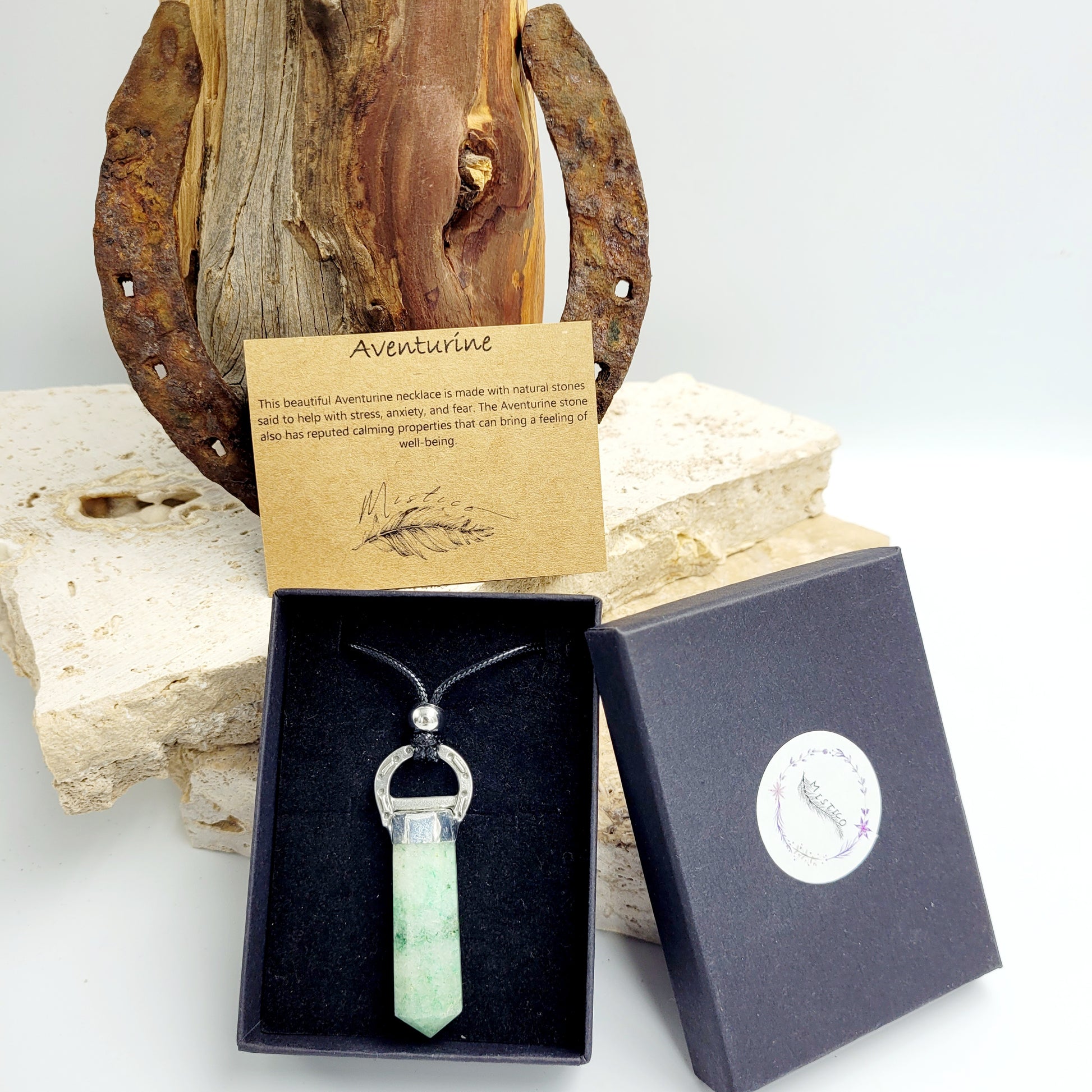 The Necklace Horseshoe Pointy Stone / Aventurine is a perfect accessory for those looking to seek answers and gain spiritual guidance. Its comforting energy helps to dissolve negative thoughts and feelings. Aventurine is the perfect choice for those seeking an emotional connection and divine insight.